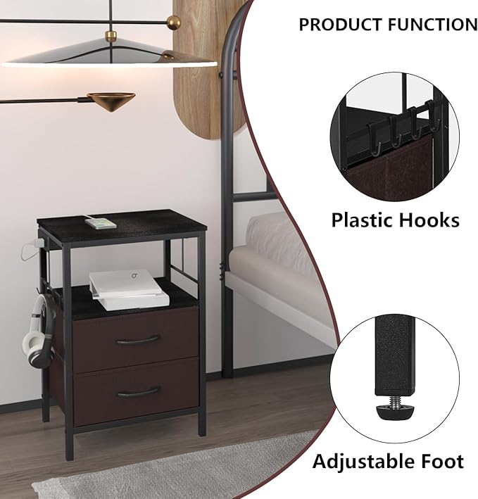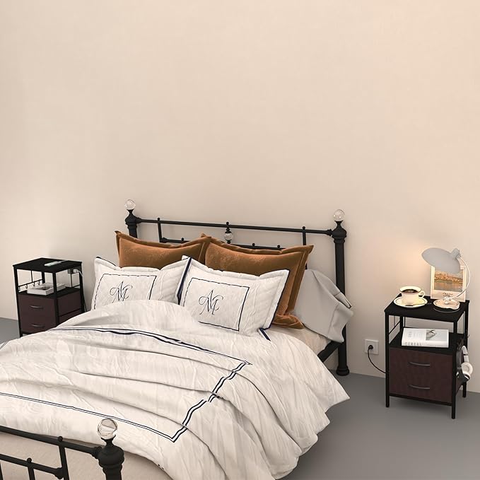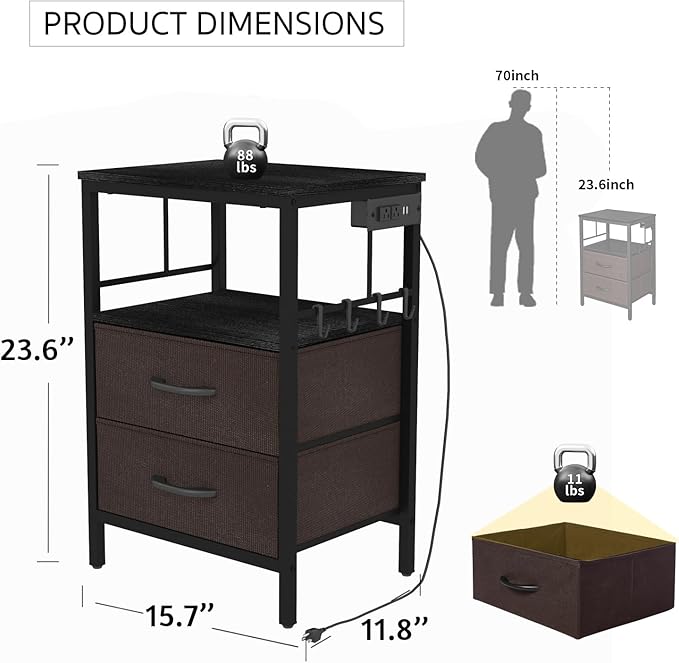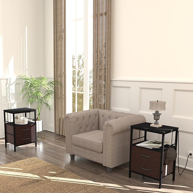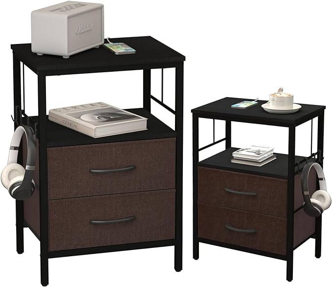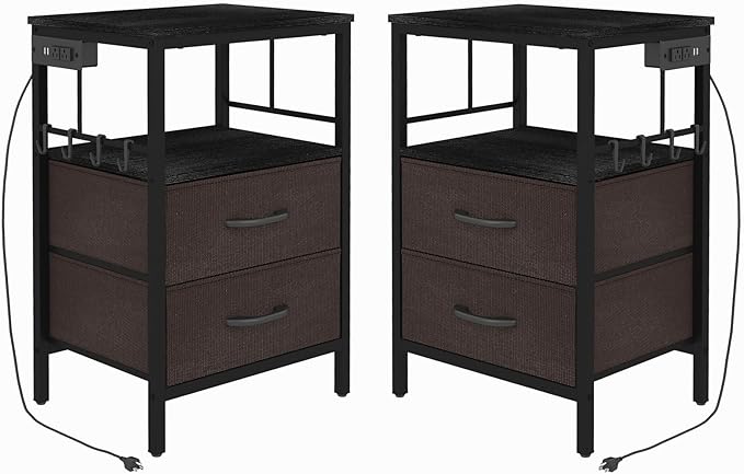Nightstands set 2 for Bedroom Decor, Bedside Table with Charging Station, Night Stands with Fabric Drawers and Open Shelf, Side Table with USB Ports & Outlets (Black,2)