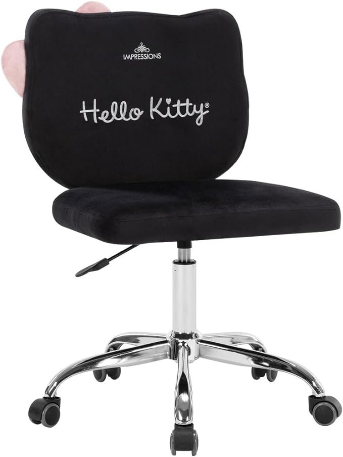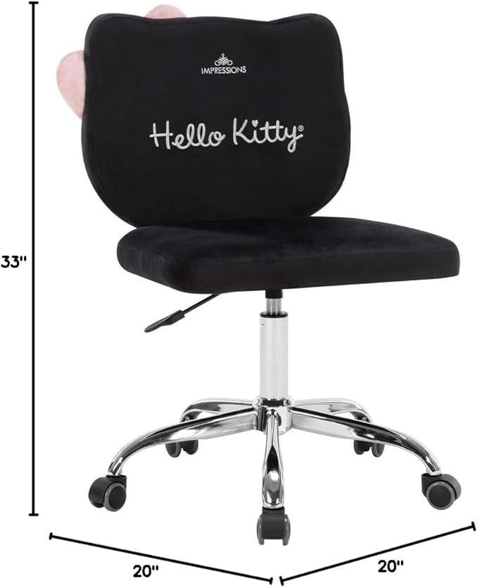 Impressions Vanity Hello Kitty Kawaii Swivel Vanity Chair for Makeup Room, Adjustable Height Cute Desk Chair with Wheels Rolling, Comfy Polyurethane Foam Back Armless Chair for Dorm (Black)