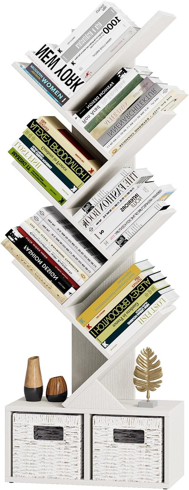 Vagusicc 6 Tier Tree Bookshelf - Modern Shelf Floor Standing Bookcase with Baskets, Tall Wood Book Storage Rack for Books/CDs, Tree Utility Book Organizer Shelves for Living Room, Home Office, Bedroom