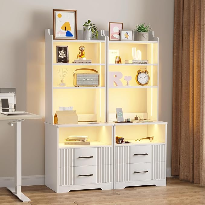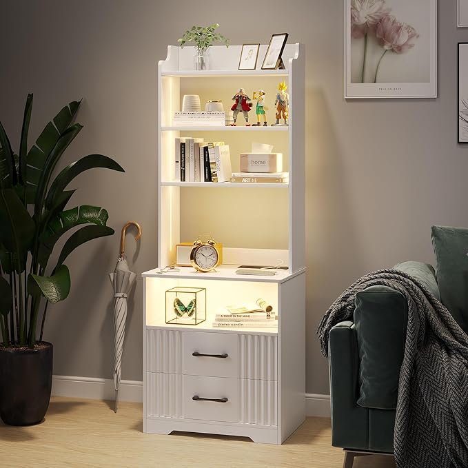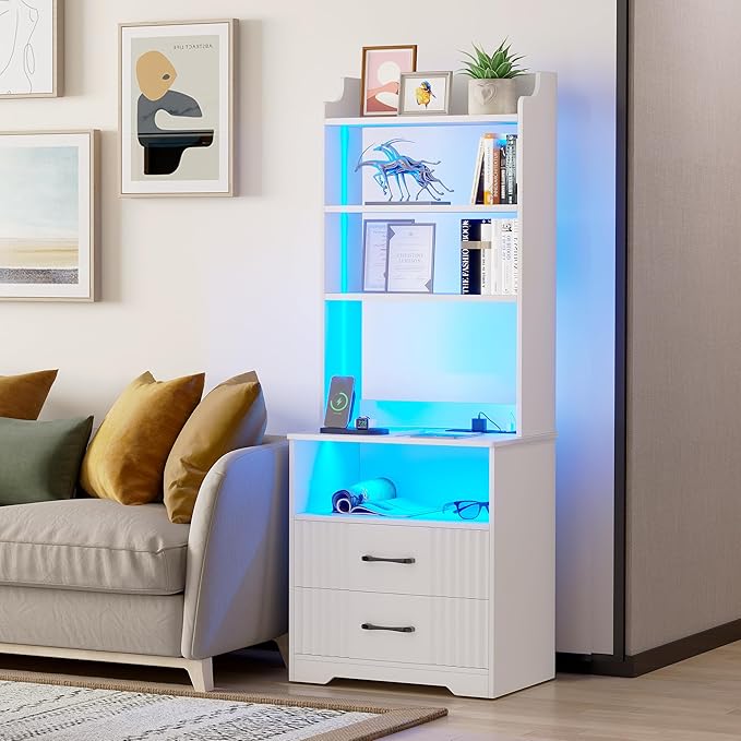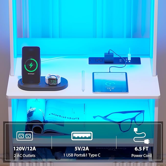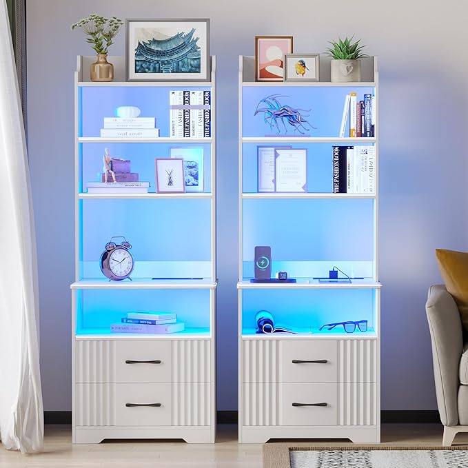 Vlsrka Nightstand Set of 2, Nightstand with Charging Station and LED Lights, Smart Night Stand with Bookshelf, Modern Bedside Tables with Storage Cabinet for Bedroom, Human Sensor Function, White