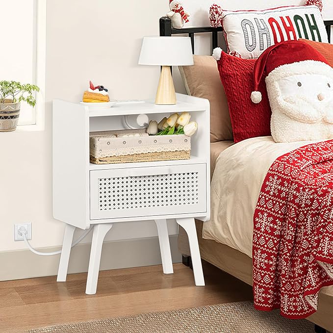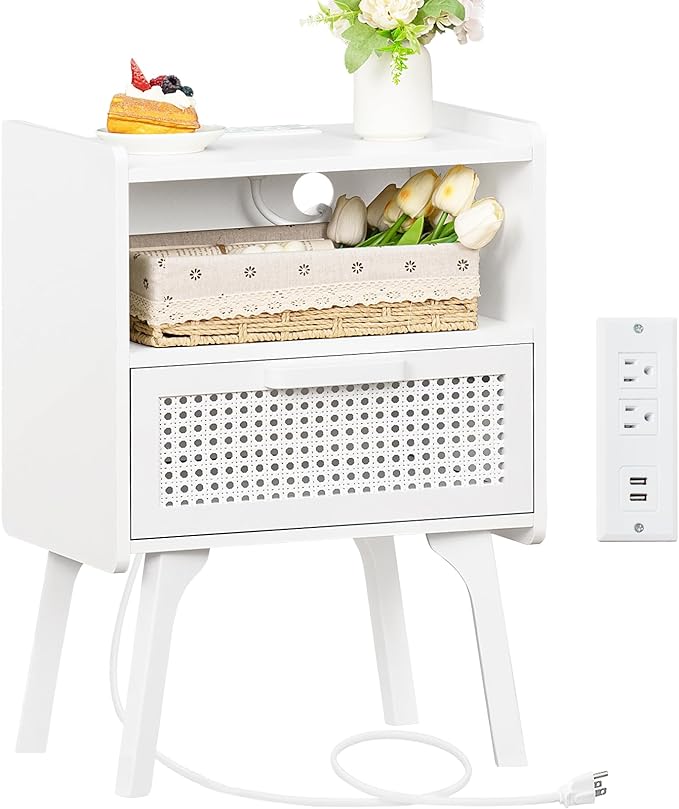 Lerliuo Rattan Nightstand with Charging Station, Side Table with Drawer Open Shelf, Cane Accent Bedside End Table with Solid Wood Legs, Night Stand for Bedroom, Dorm and Small Spaces (White)