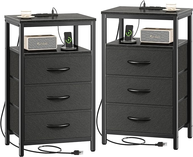 Nightstands Set of 2, 27.6 Inch End Tables with Charging Station, Side Tables with Fabric Drawers, Bedside Tables with USB Port and Outlet, Night Stands for Bedroom, Black