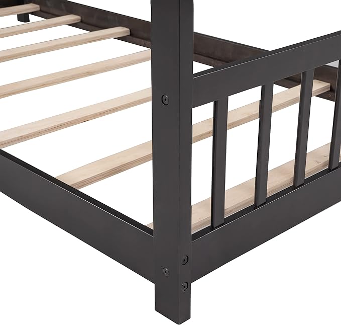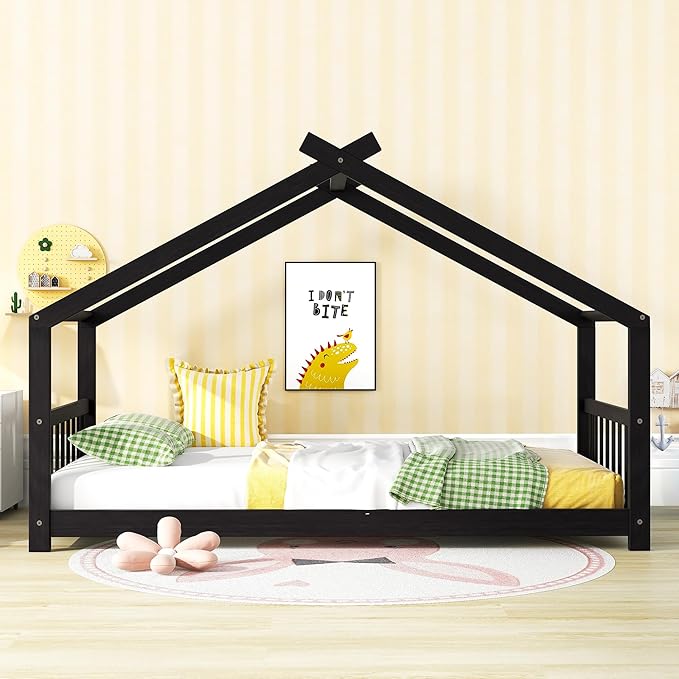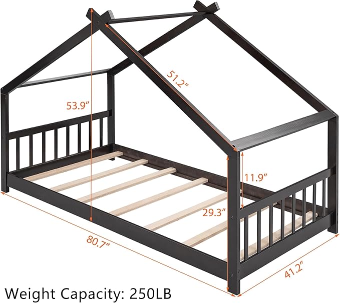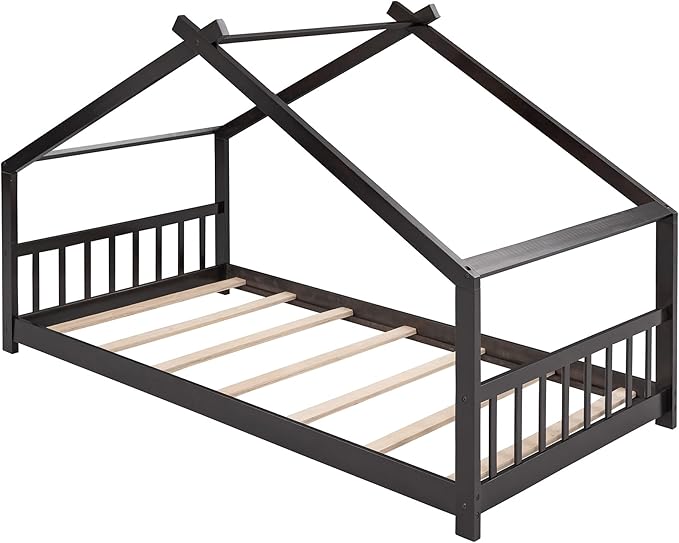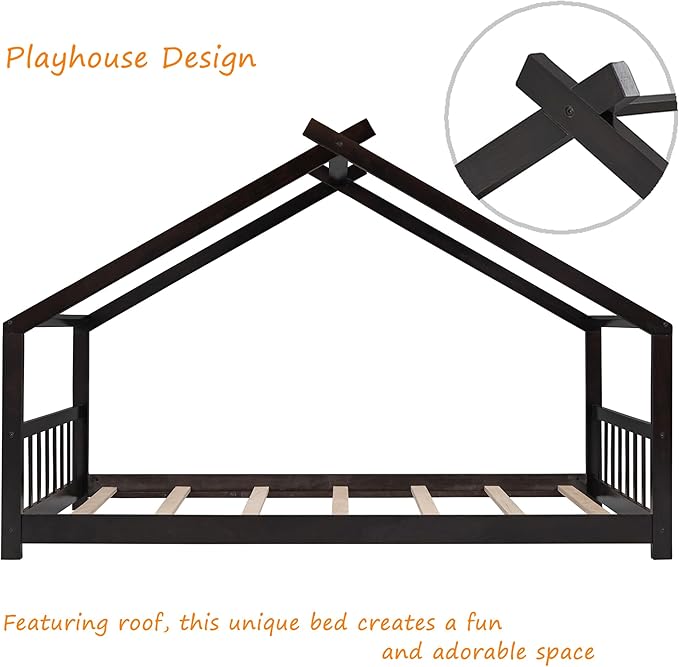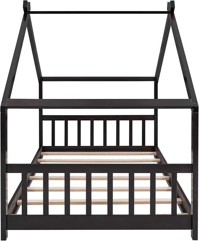 Montessori Floor Bed Frame Twin Size, Twin Floor Bed Frame with Headboard, Footboard and Slats, Wood Montessori Bed Frame/Montessori House Bed for Kids, Girls, Boys(Espresso)
