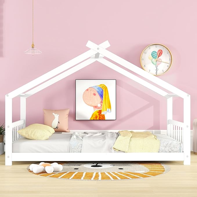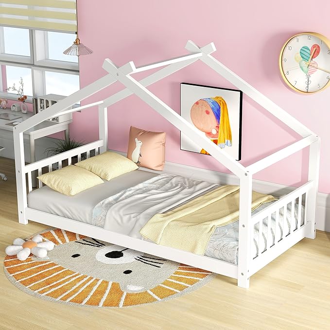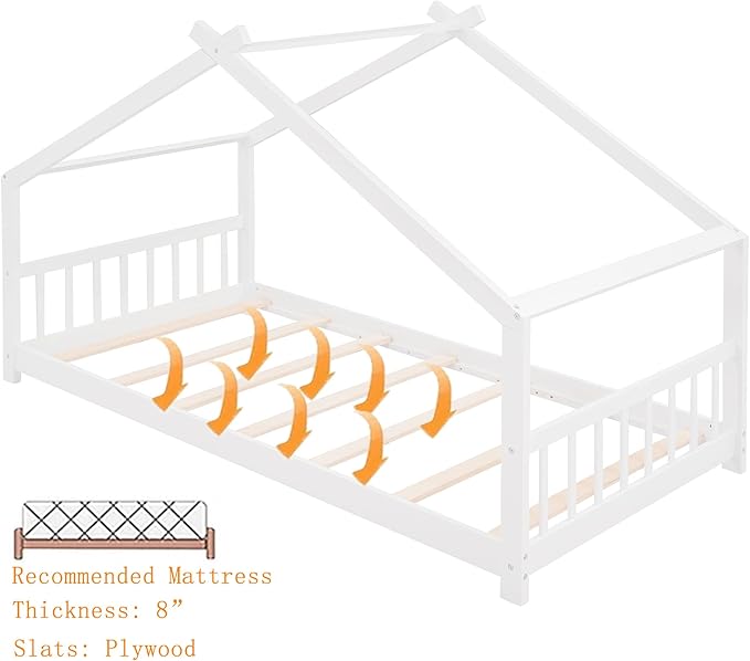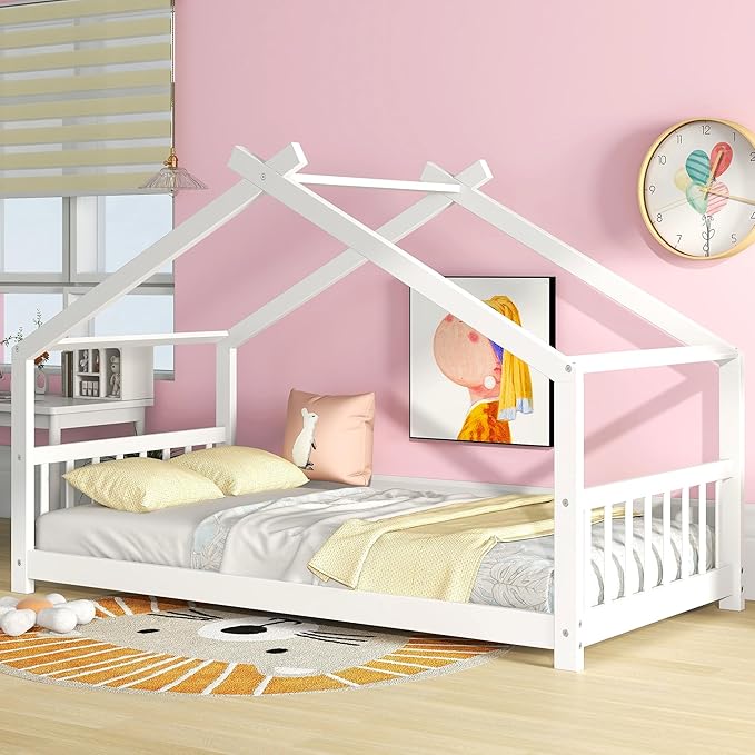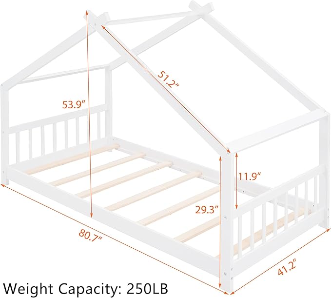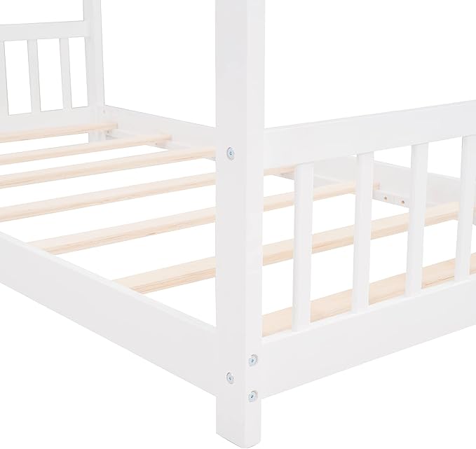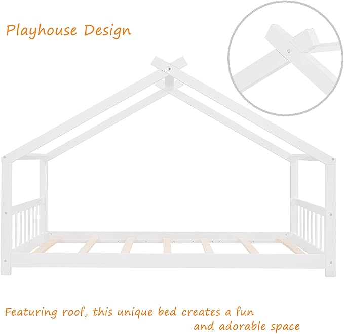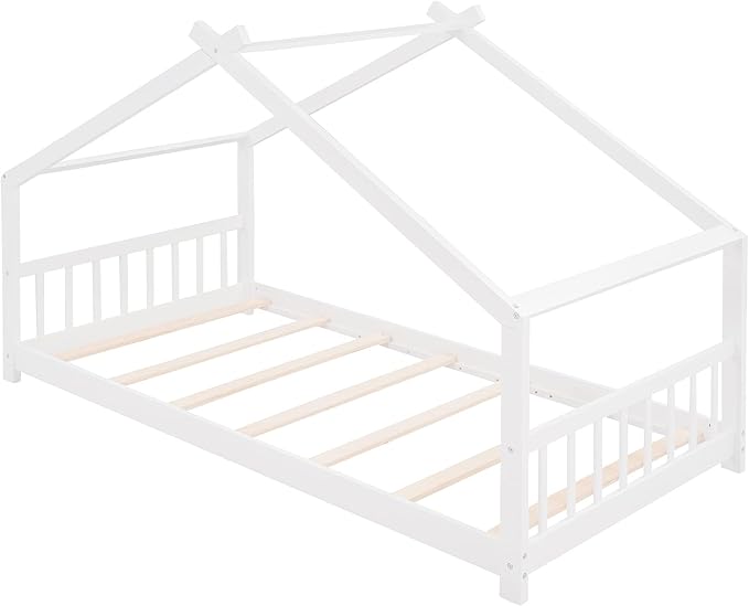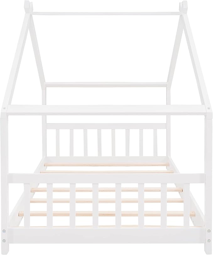 Montessori Floor Bed Frame Twin Size, Twin Floor Bed Frame with Headboard, Footboard and Slats, Wood Montessori Bed Frame/Montessori House Bed for Kids, Girls, Boys(White)