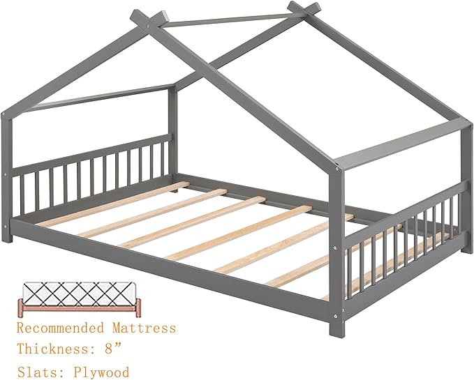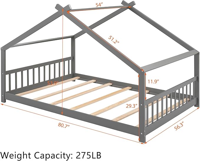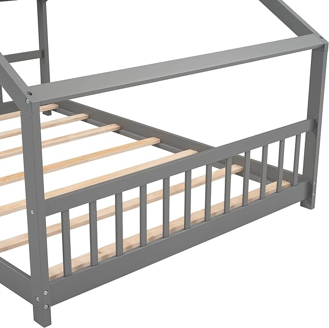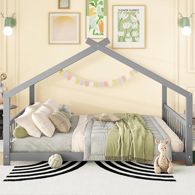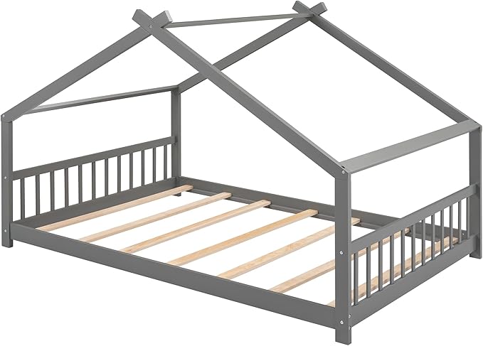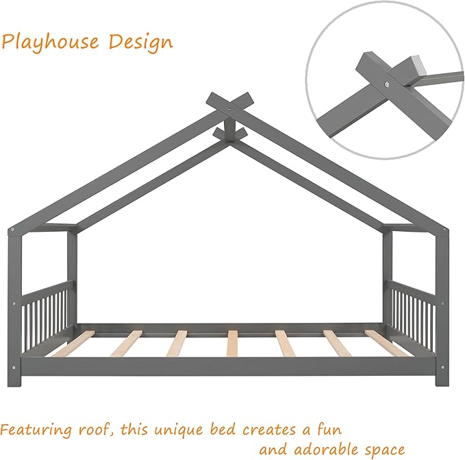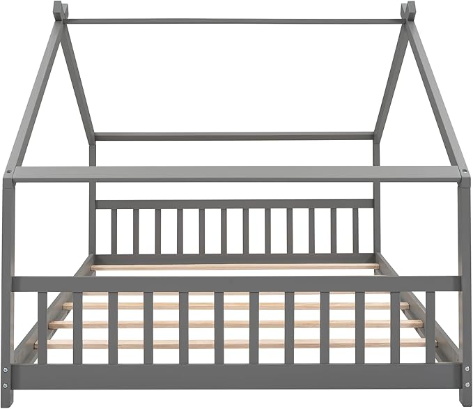 Montessori Floor Bed Frame Full Size, Full Floor Bed Frame with Headboard, Footboard and Slats, Wood Montessori Bed Frame/Montessori House Bed for Kids, Girls, Boys(Gray)