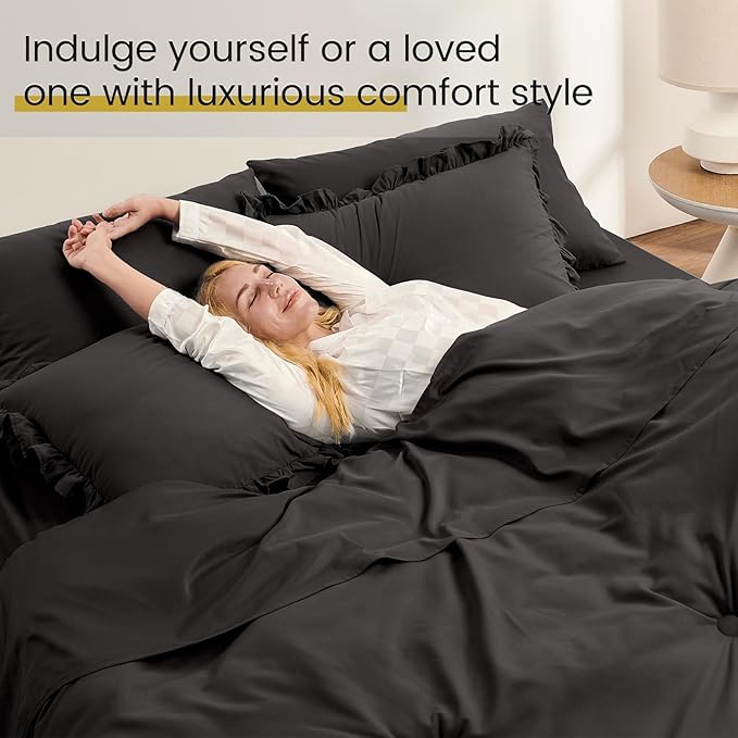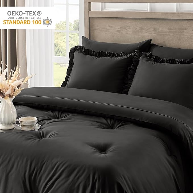 King Size Bed in a Bag 7 Pieces King Size Comforter Set, Ruffle Shabby Chic Bedding Comforter Set Black Bed Set with Comforter, Pillowcases, Flat Sheet, Fitted Sheet and Pillow Shams