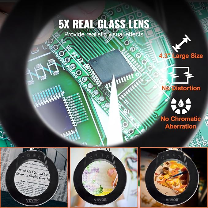 VEVOR Magnifying Glass with Light and Stand, 5X Magnifying Lamp, 4.3" Glass Lens, Base and Clamp 2-in-1 Desk Magnifier with Light, 64 LED Lights 5 Color Modes, for Close Work Reading Repair Crafts