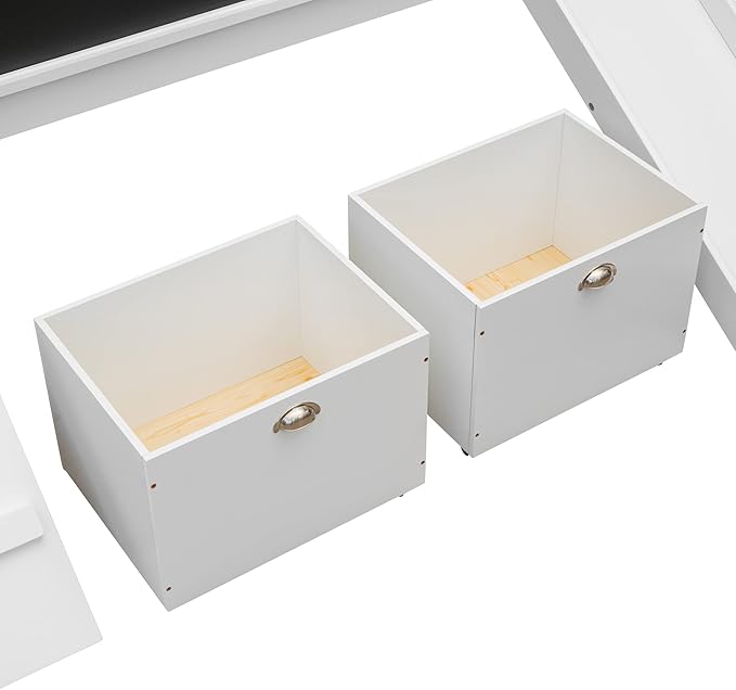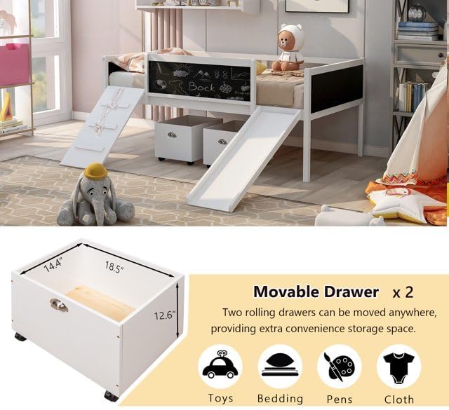 Bellemave Twin Size Wooden Low Loft Bed Frame with Two Storage Boxes,Kids Loft Bed with Slide and Climbing Frame for Boys & Girls,White