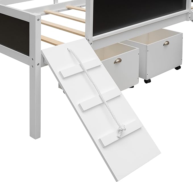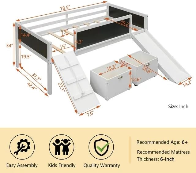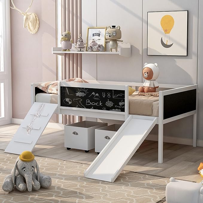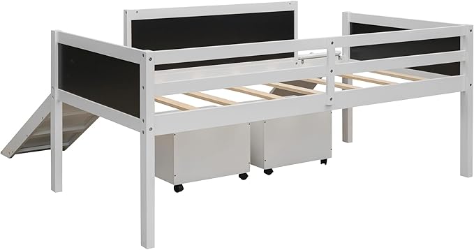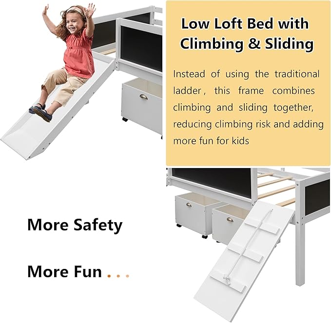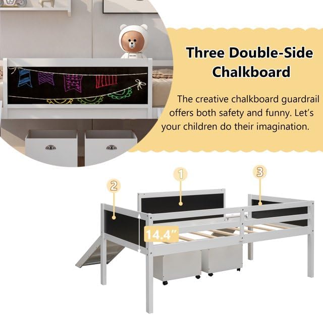 About This 🛏️ 【Double-sided Chalkboard】Three-sides of this low loft bed are equipped with double-sided chalkboards,and thoughtful design of the chalk...