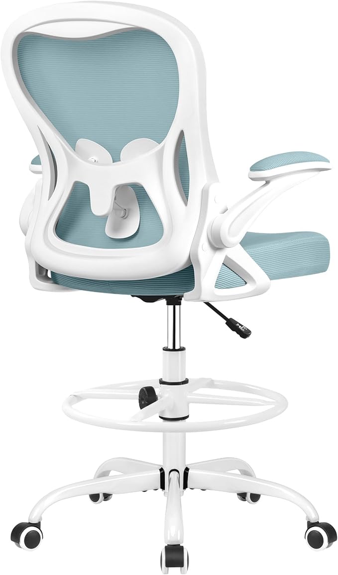 Drafting Chair, Tall Office Chair Ergonomic Standing Desk chair, Lumbar Support Computer Chair Swivel Task Rolling Chair with Adjustable Flip-up Armrests & Foot Ring (Light Blue)