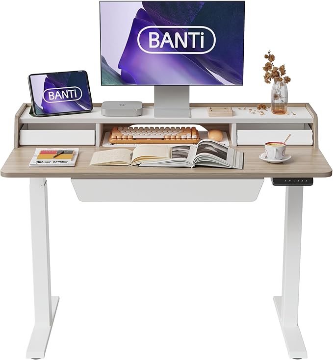 BANTI Height Adjustable Electric Standing Desk with Three Drawers, 48 x 25 Inch Table with Storage Shelf, Sit Stand Desk with Storage Space, Splice Board with White Frame/Light Walnut Top, 48 inch