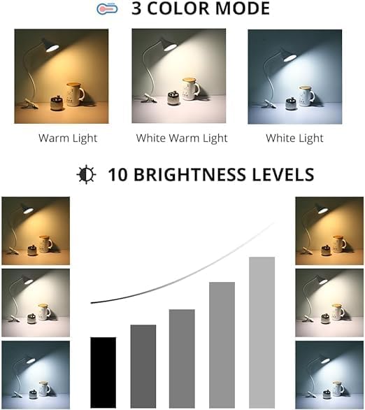 About This ๐3 Lighting Modes & 10 Dimmable Brightness -- Clip on light offers 3 lighting modes: 3000K warm light,...