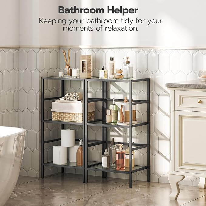 HOOBRO 3-Tier Bookcase, Tempered Glass Bookshelves, Record Storage Rack with Side Fence, Storage Shelves for Bathroom, Slim Shelving Unit for for Living Room, Home Office, Black BK81CJ01