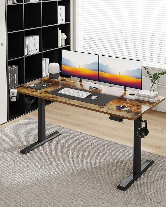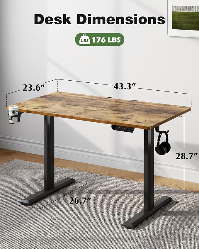 Electric Standing Desk, 43 Inch Height Adjustable Home Office Table with Headphone Hook and Cup Holder, Black Legs/Rustic Brown Top