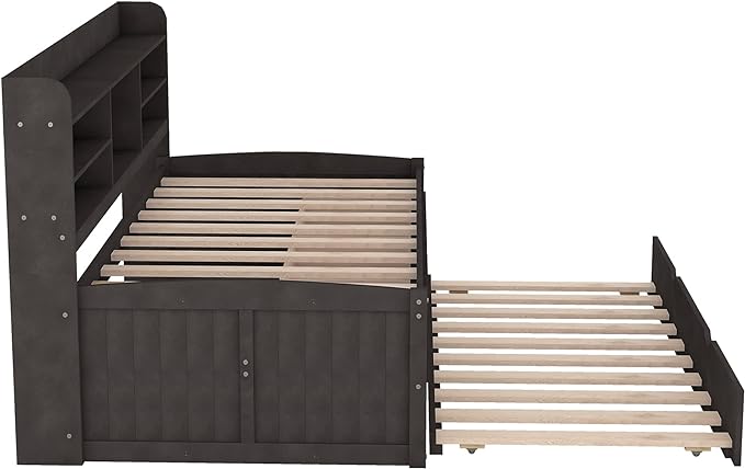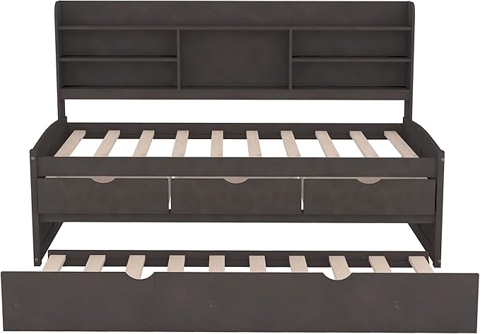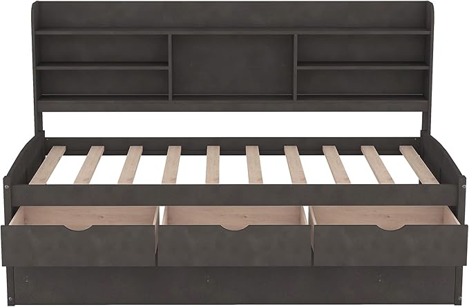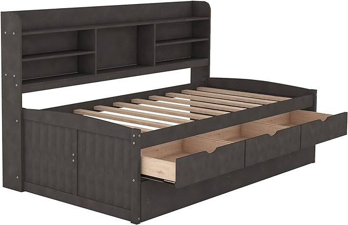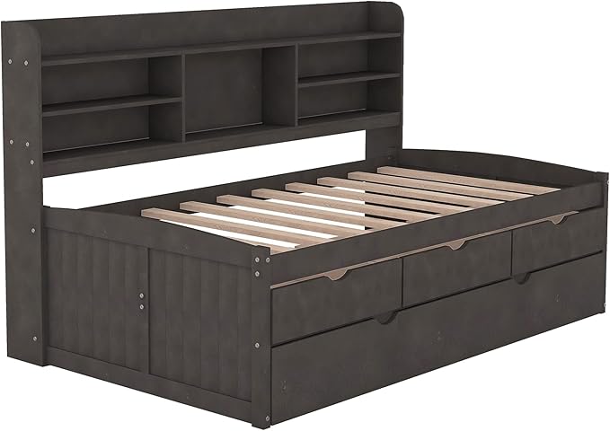 Twin Size Captain Bed with 3 Storage Drawers and Trundle, Wood Twin Bed Frame with Built-in Bookshelves for Kids Teens Adults, Antique Gray