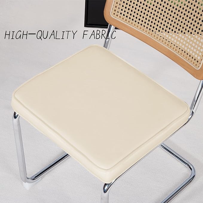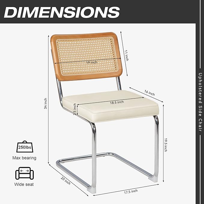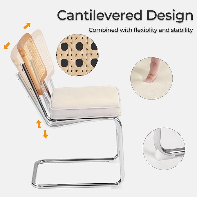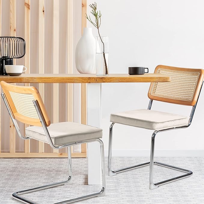 Dining Chair Set of 2, Mid-Century Modern Rattan Dining Chairs with Metal Chrome Legs, Natural Cane Backrest Upholstered for Home Kitchen,Dining Room and Patio, Cream