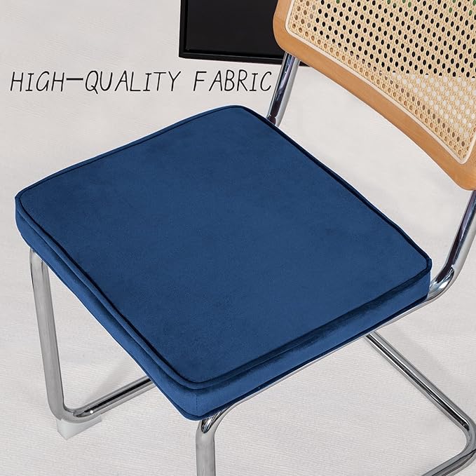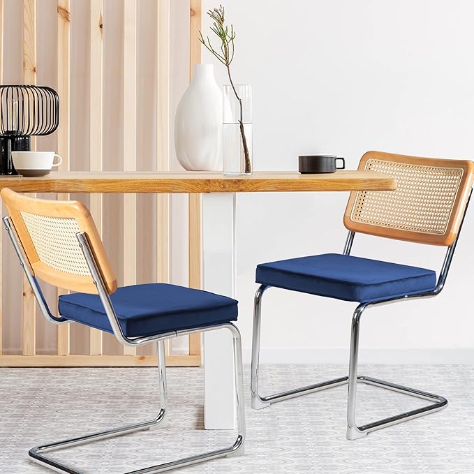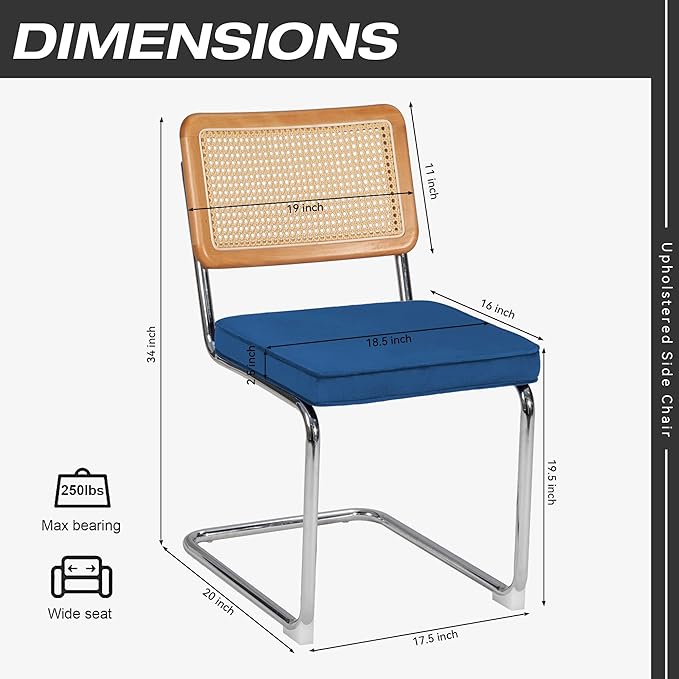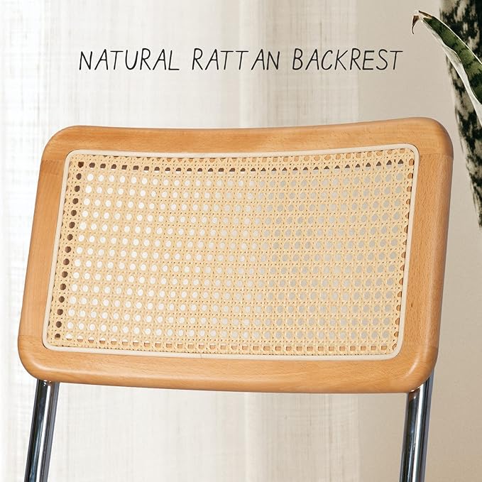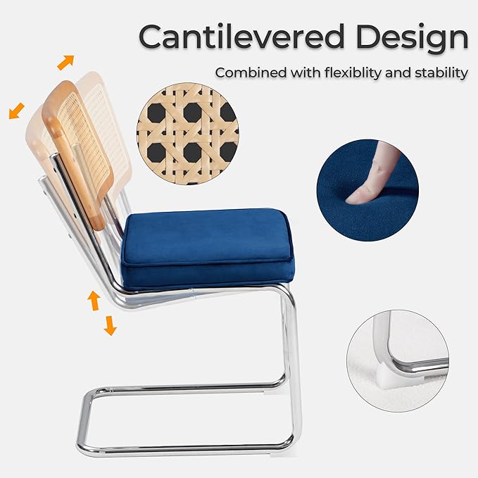 Dining Chair Set of 2, Mid-Century Modern Rattan Dining Chairs with Metal Chrome Legs, Natural Cane Backrest Upholstered for Home Kitchen,Dining Room and Patio, Deep Blue