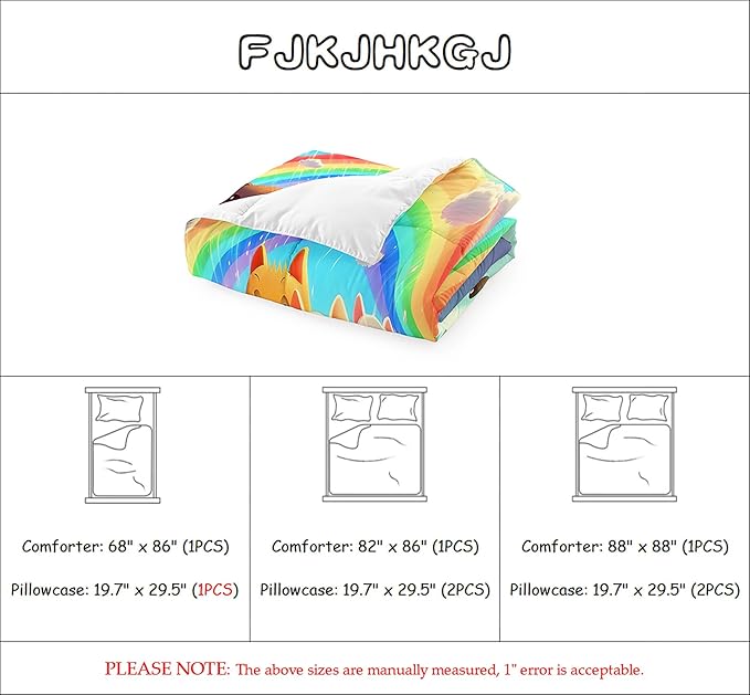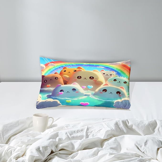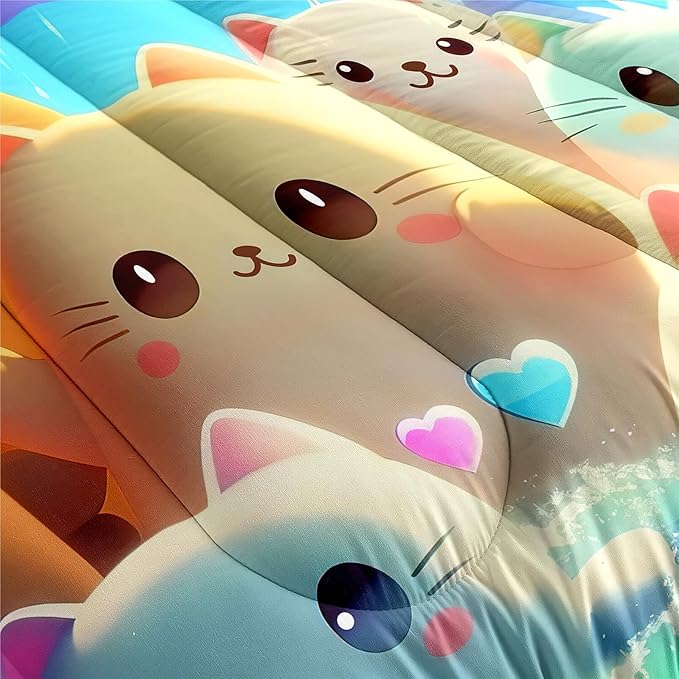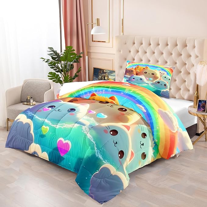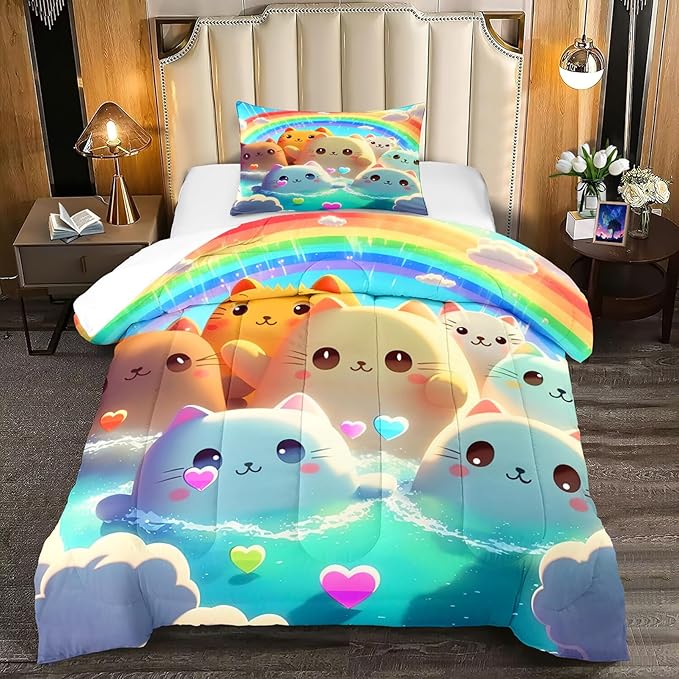 Cat Comforter Set - Cartoon Cat Twin Bedding Set for Girls Cute Cat Rainbow Printed Kids Bedding Set for Girls Kids Teens All Season Kawaii Cat Twin Quilt Set, 1 Comforter+1 Pillowcase