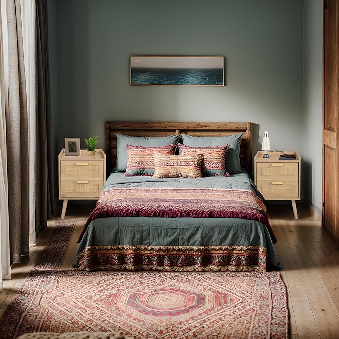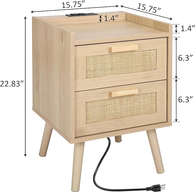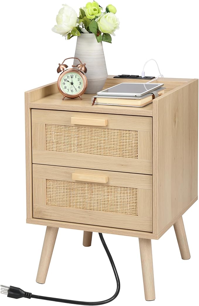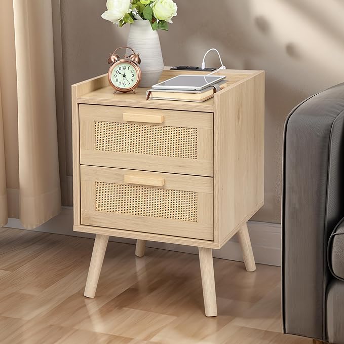 Finnhomy Nightstand with Charging Station, Bedside Table with 2 Hand Made Rattan Decorated Drawers, Night Stand with Storage for Bedroom, Natural