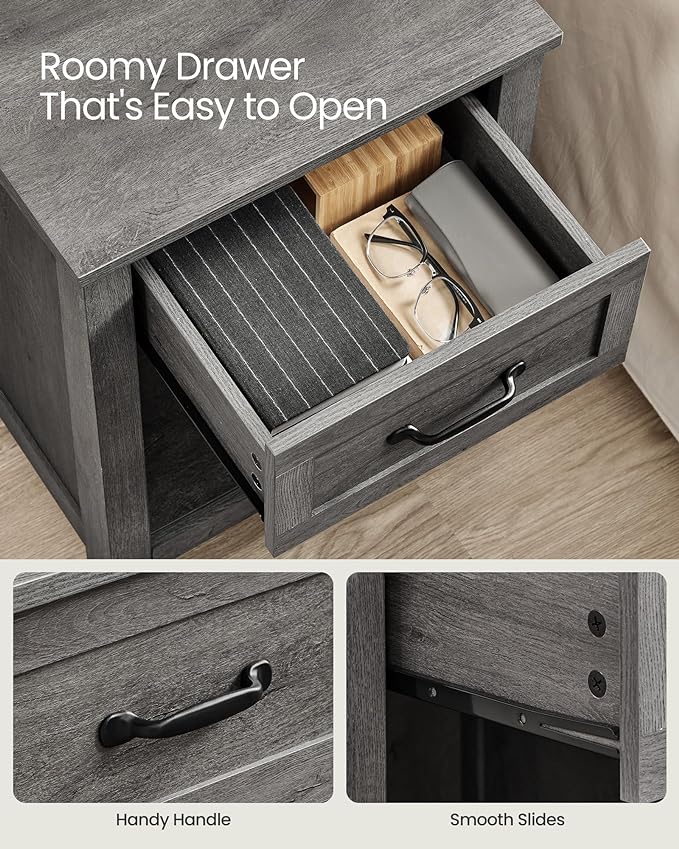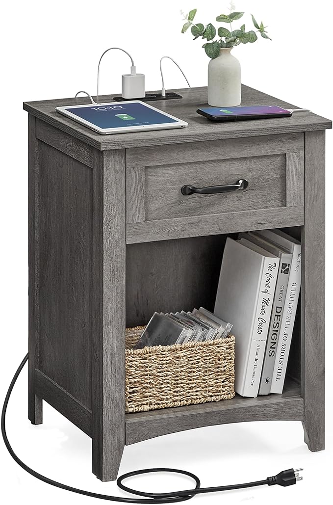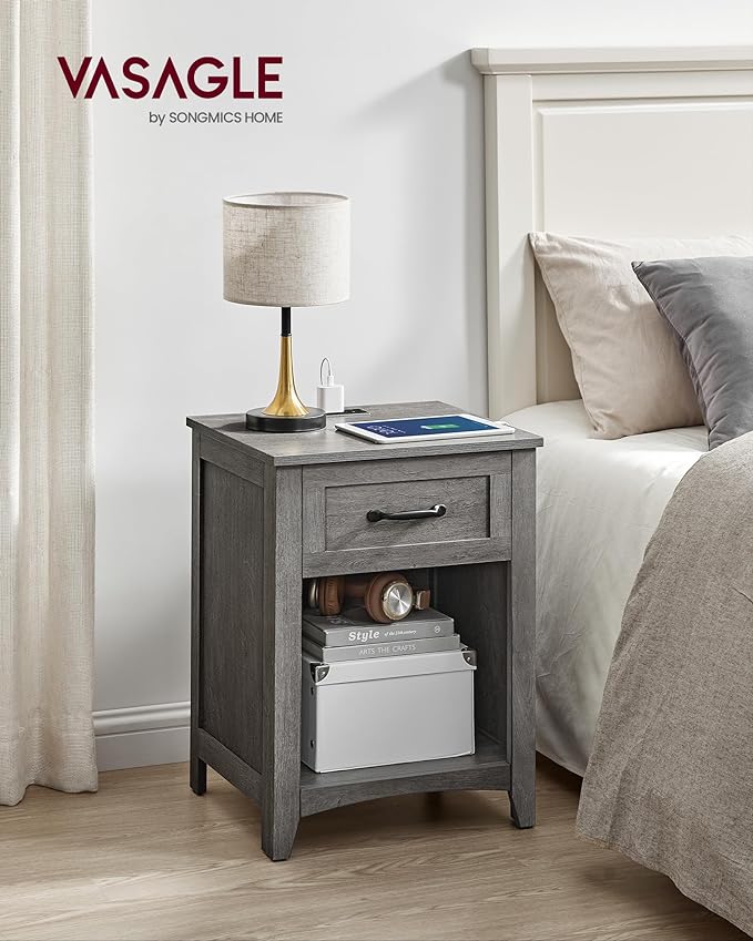 VASAGLE Farmhouse Nightstand with Charging Station, Bedside Table with Drawer, Open Compartment, Side Table with Storage, for Bedroom, Misty Gray ULET659G68
