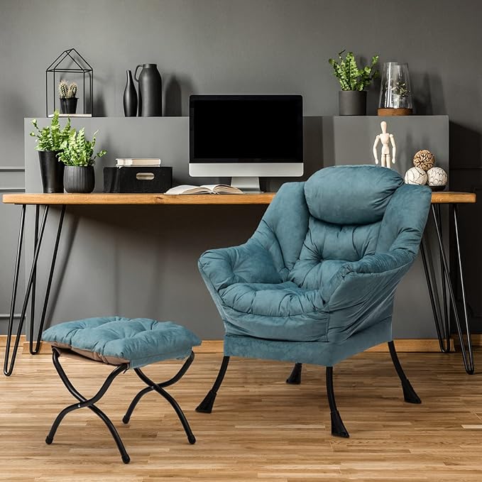 AbocoFur Fabric Lazy Chair with Foldable Ottoman, Accent Comfy Lounge Arm Chair and Folding Footrest Stool Set, Leisure Sofa Reading Chair and Footstool for Living Room, Bedroom, Dorm, Blue