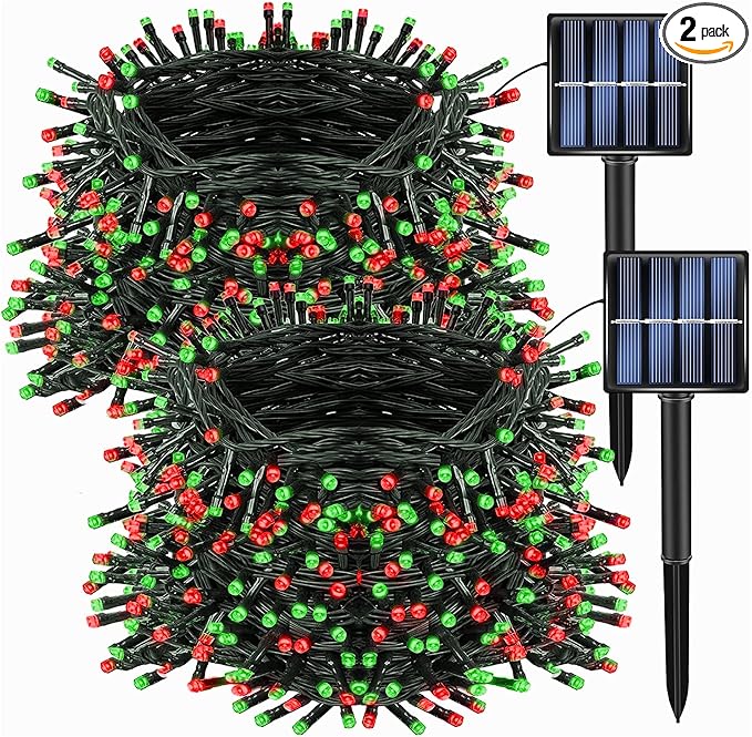 Dazzle Bright 2 Pack Total 132FT 400LED Red and Green Christmas Solar String Outdoor Lights, Solar Powered with 8 Modes Waterproof Fairy Lights for Bedroom Patio Garden Tree Party Yard Decoration