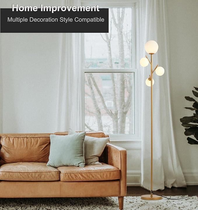 4 Globe Gold Floor Lamp, Modern Sputnik Tree Standing Lamp with Frosted Glass Ball Lampshade & 3000K LED Bulbs, Mid Century Contemporary Tall Lamp for Living Room, Bedroom - Antique Brass