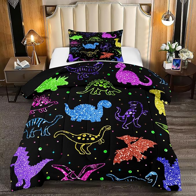 Dinosaur Twin Bedding Set, Cartoon Kids Bedding Dinosaur Twin Size Comforter Set for Boys Teen Soft Breathable Black Dinosaur Comforter Set Twin (1 Comforter 1 Pillowcase)