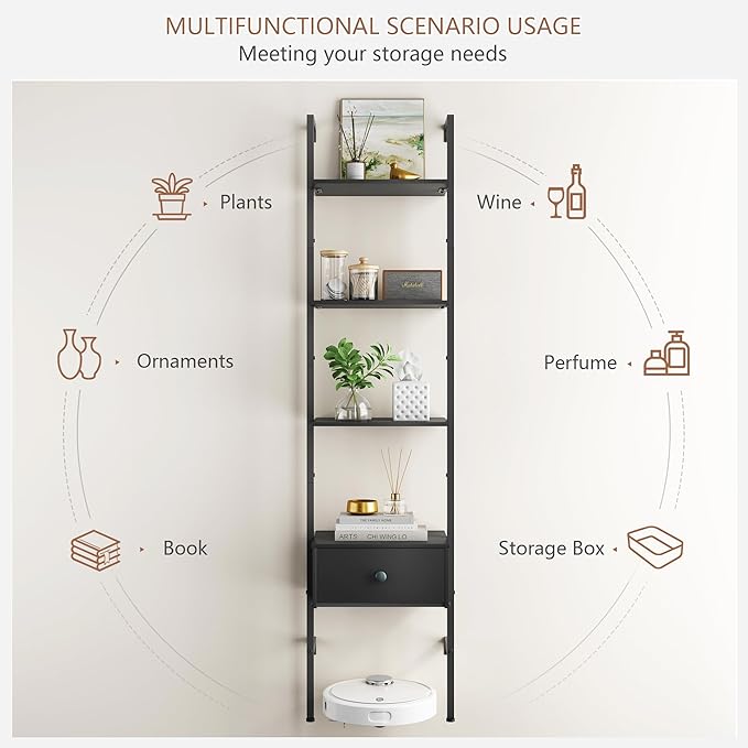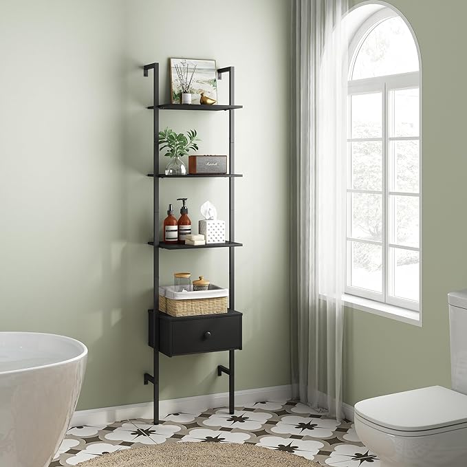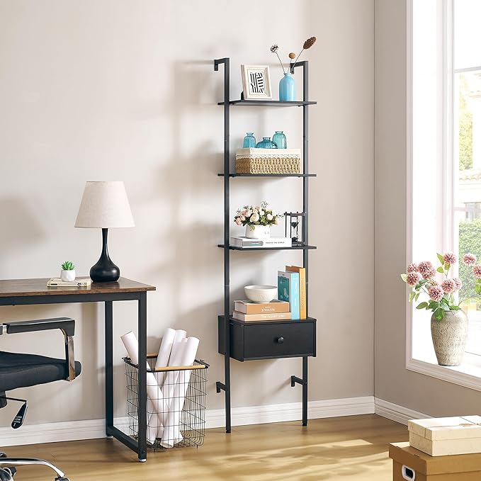 Tajsoon Ladder Shelf, Tall Bookcase with Storage Drawers, 4-Tier Wood Wall Mounted Bookshelf, Open Display Rack, Storage Shelves for Bedroom, Home Office, Collection, Plant Flower, Black