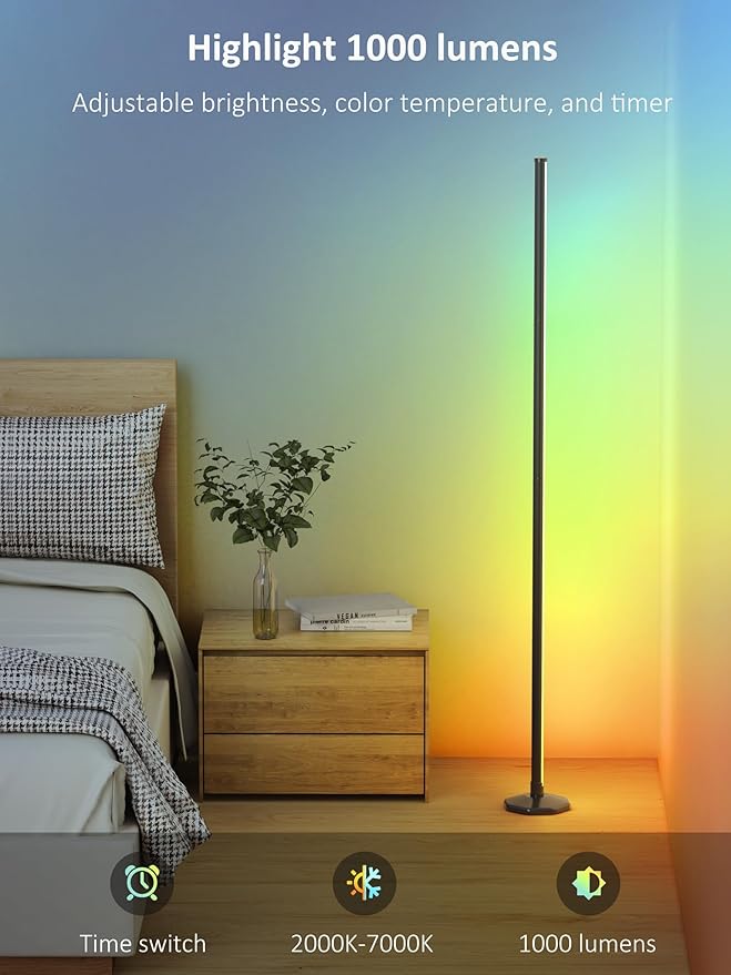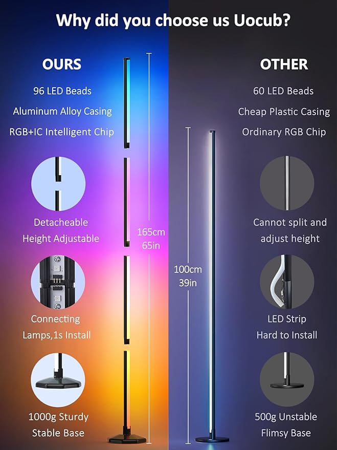 65" LED Corner Floor Lamp:Uocub 16 Million DIY Colors & 68+ Scene RGB Smart Modern Floor Lamp with Timing, Music Sync, App and Remote Control Standing Lamp for Living Room (Dark Grey)