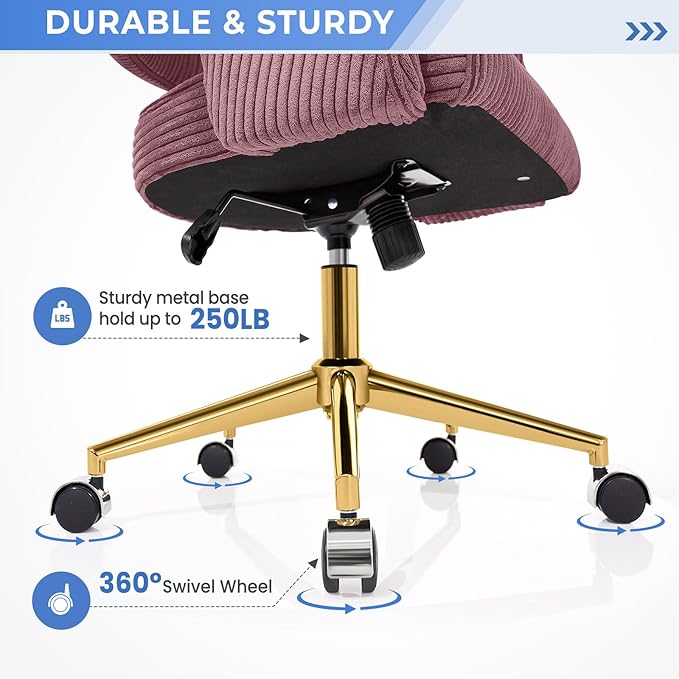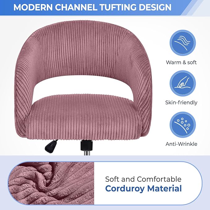 Rose Pink Office Chair, Corduroy Home Office Desk Chairs with Wheels and Gold Base, Mid Century Swivel Vanity Chair, Comfy Rolling Chair for Bedroom, Living Room, Study