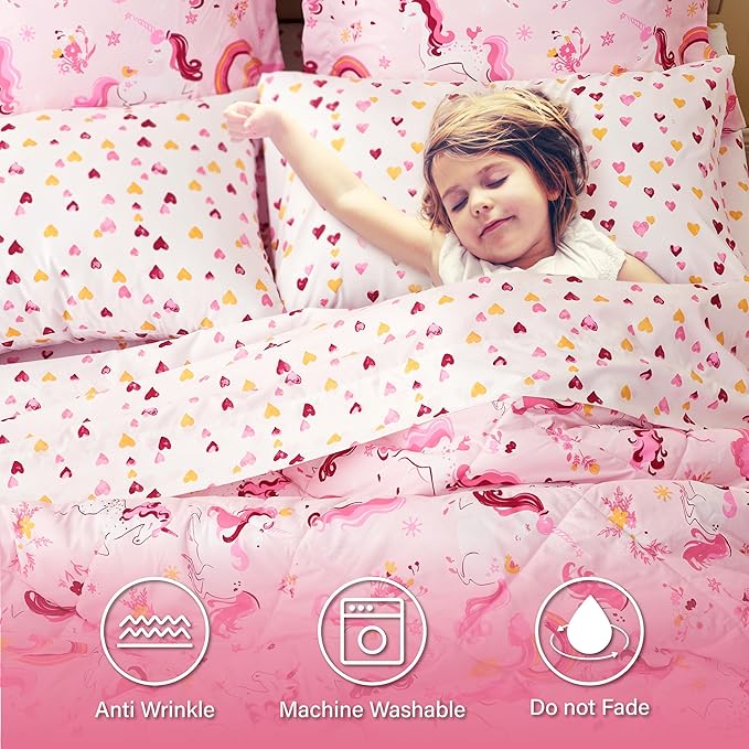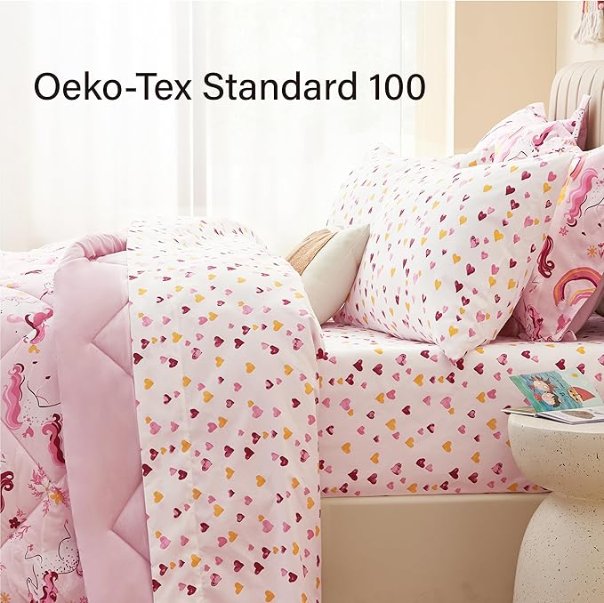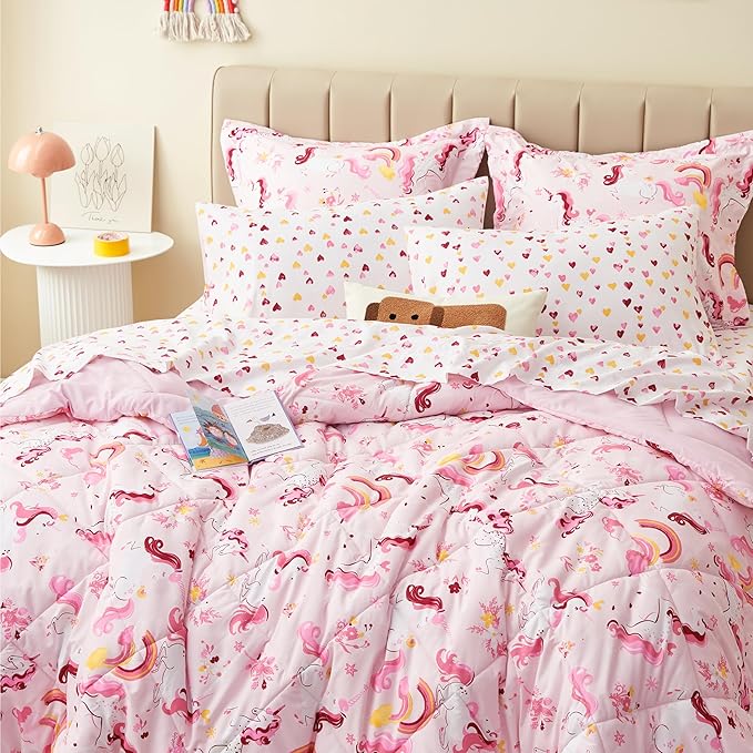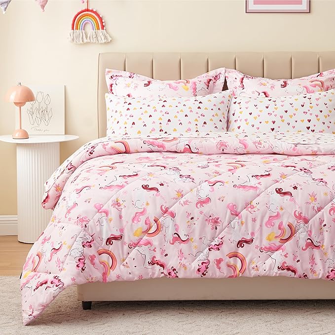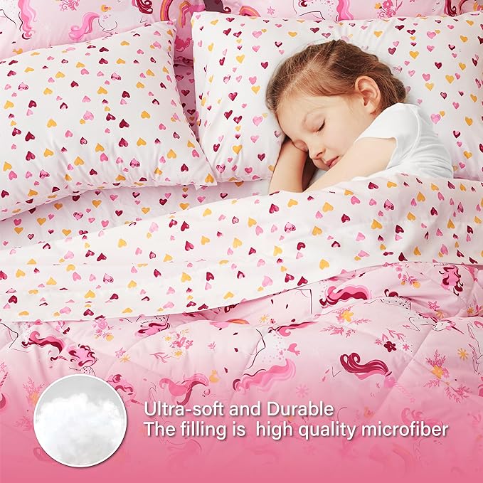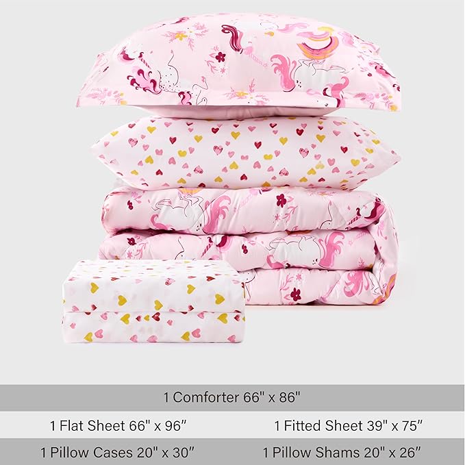 Twin Unicorn Kids Bedding Set for Girls, 5 Pieces Super Soft Lightweight Microfiber Comforter Set with Sheets, Bed in a Bag, Durable Children Bed Set