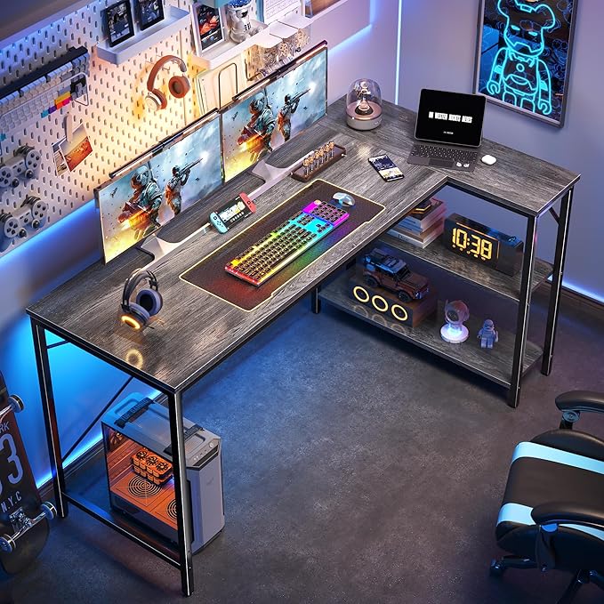 L Shaped Desk, 55 Inches Computer Desk with Reversible Storage Shelves, Gaming Desk, Corner Desk Home Office Desks, Writing Desk Study Desk with Metal Frame, Gray