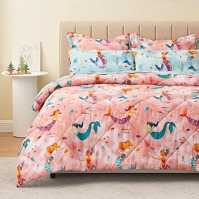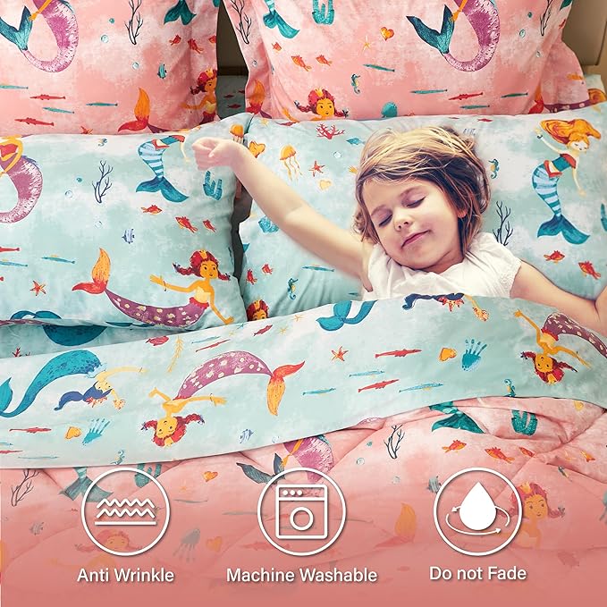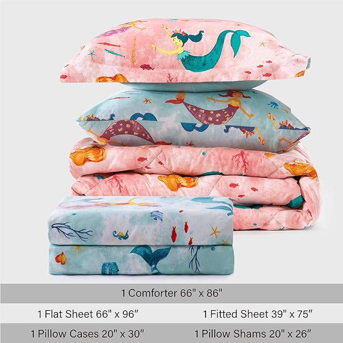 Twin Size Mermaid Kids Bedding Set for Girls, 5 Pieces Super Soft Lightweight Microfiber Comforter Set with Sheets, Bed in a Bag, Durable Children Bed Set