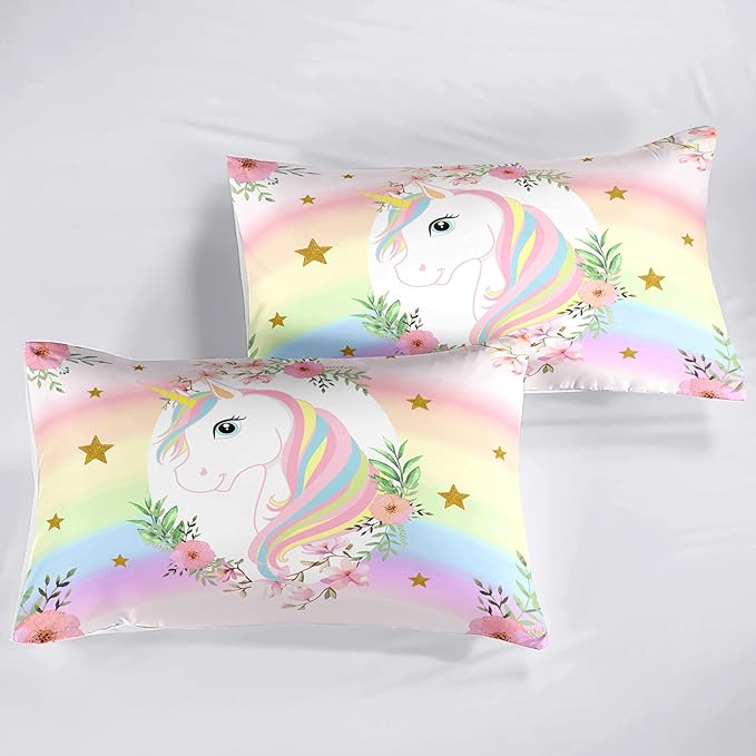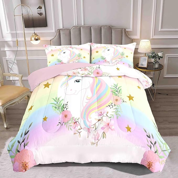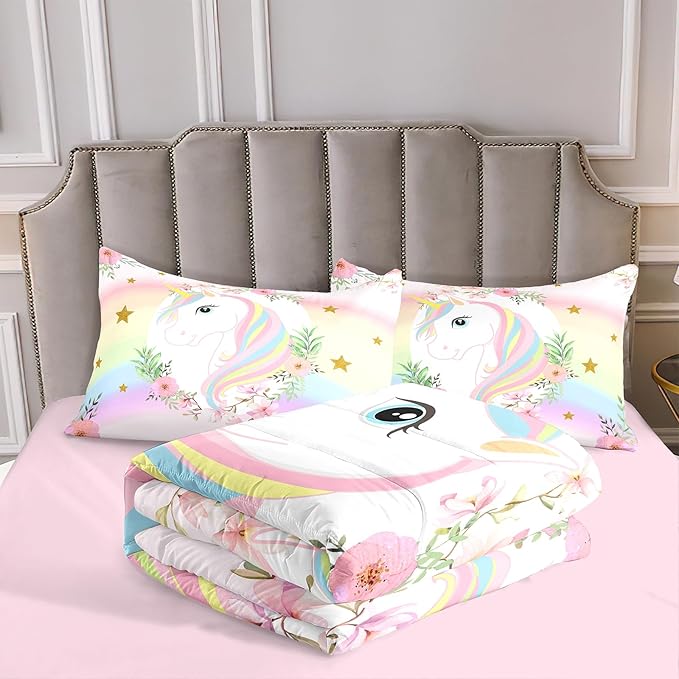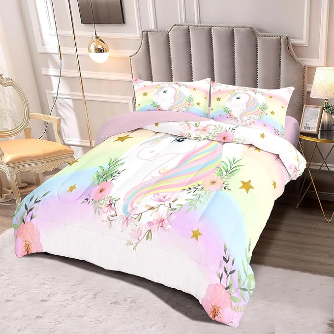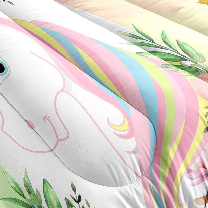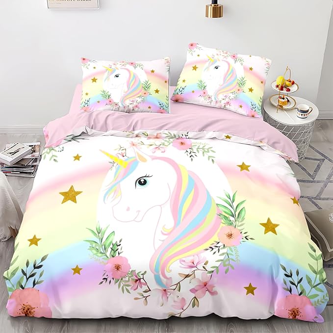 Kids Comforter Bedding Set 3 Piece Super Soft Breathable Print Kids Bedding Sets for Girls, Machine Washable Durable Comforter Set with Comforter, 2 Pillowcases Flowers Stars (Twin,Unicorn)