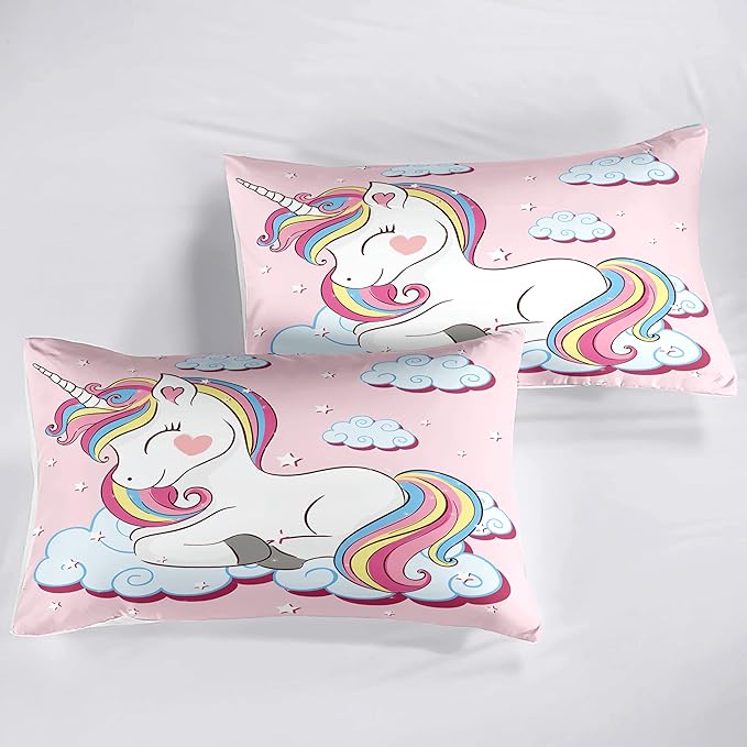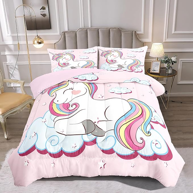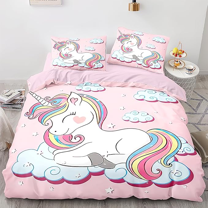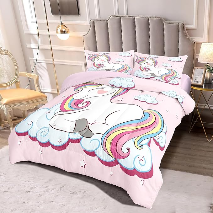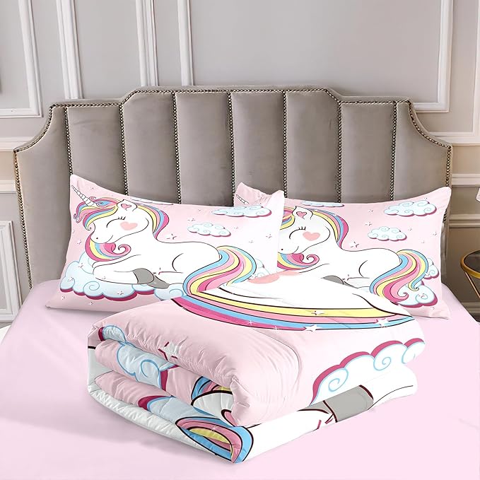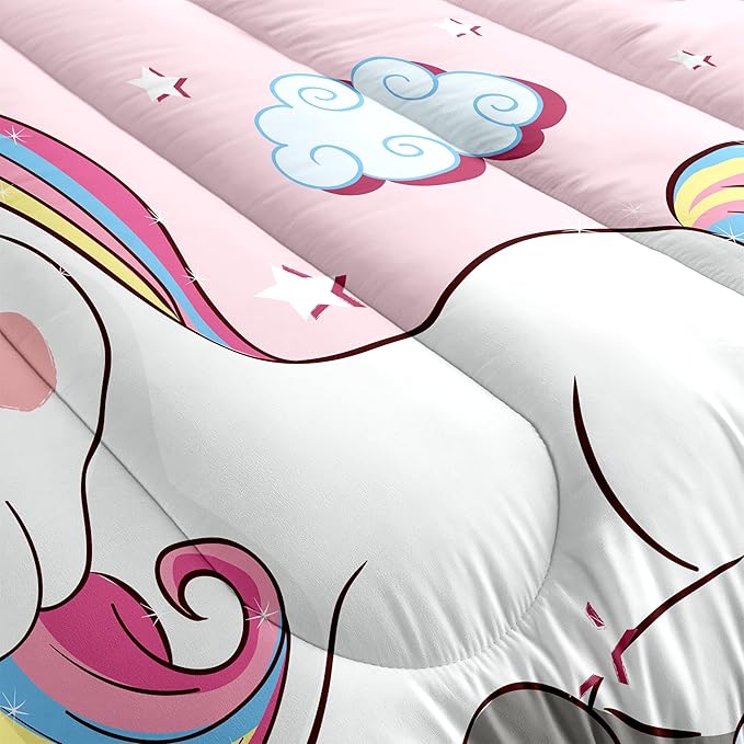 Kids Comforter Bedding Set Twin Size, 3 Piece Super Soft Breathable Print Kids Bedding Sets for Girls, Machine Washable Durable Comforter Set with Comforter and 2 Pillowcases (Twin, Pink Unicorn)