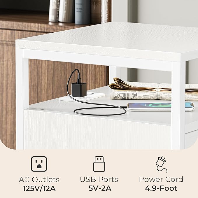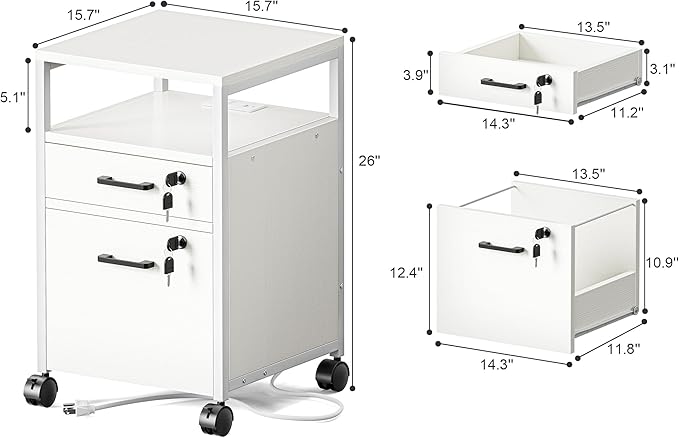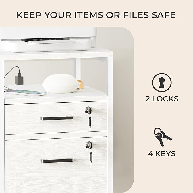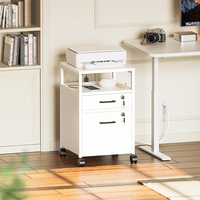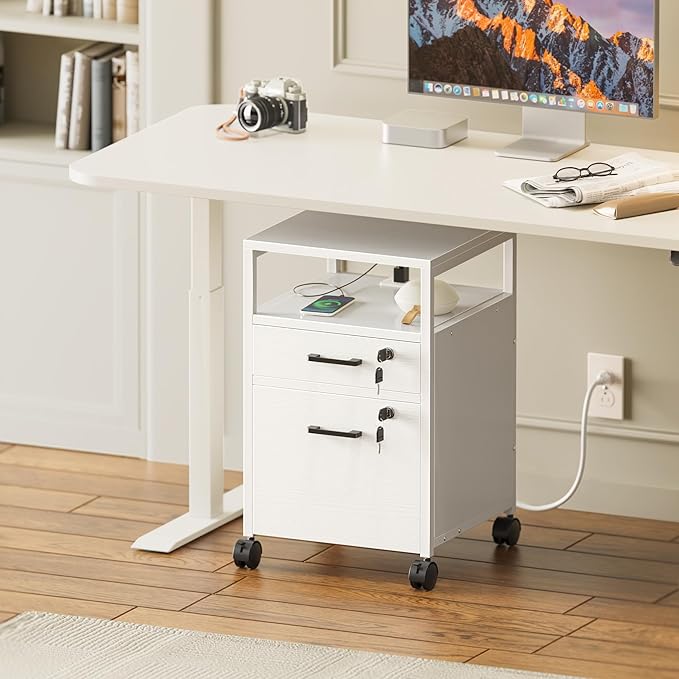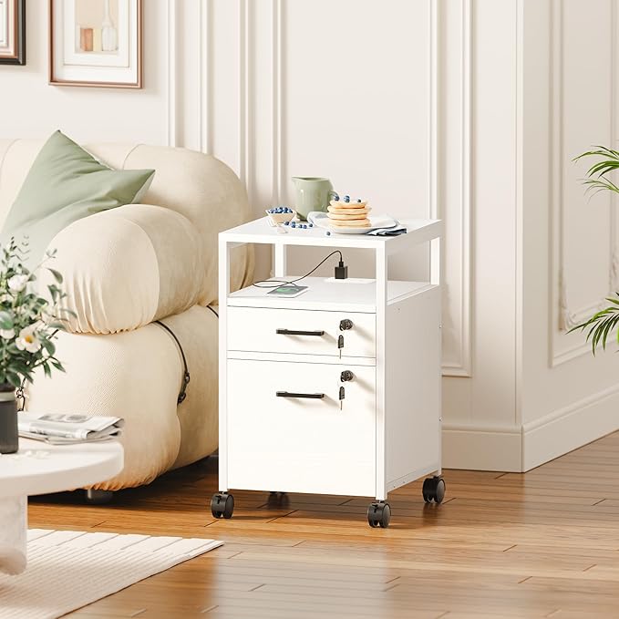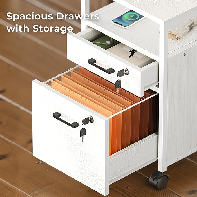 SUPERJARE File Cabinet with Lock & Charging Station, 2 Drawers Rolling Filing Cabinet, Office File Cabinet with Wheels & Open Shelf, for Home Office, A4/Letter Size Files - White