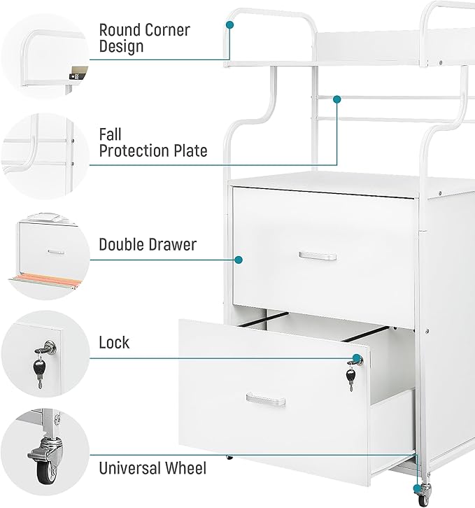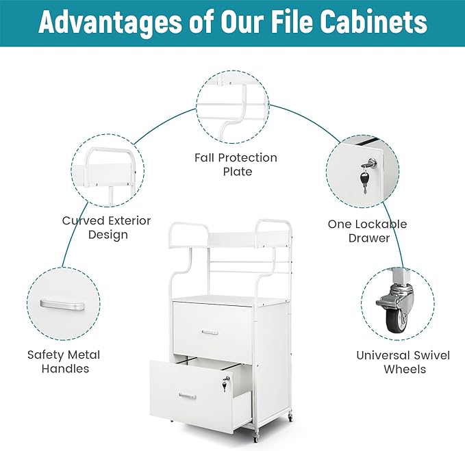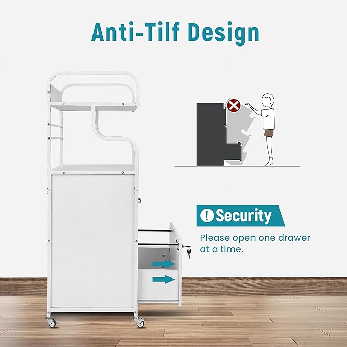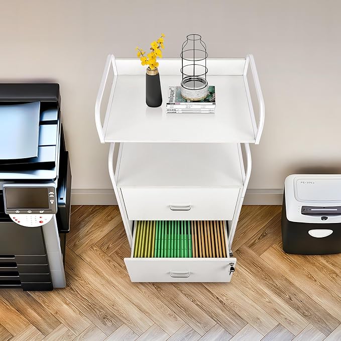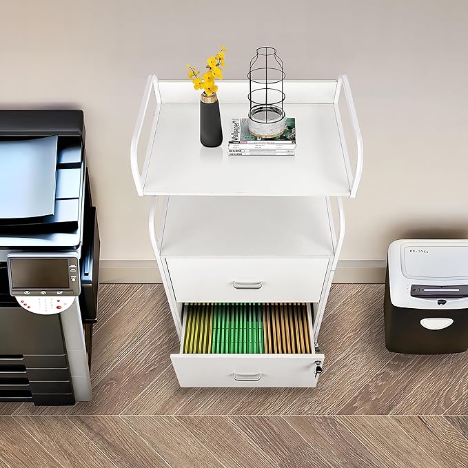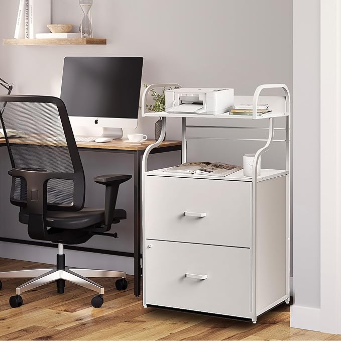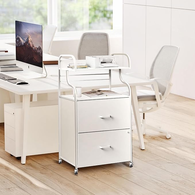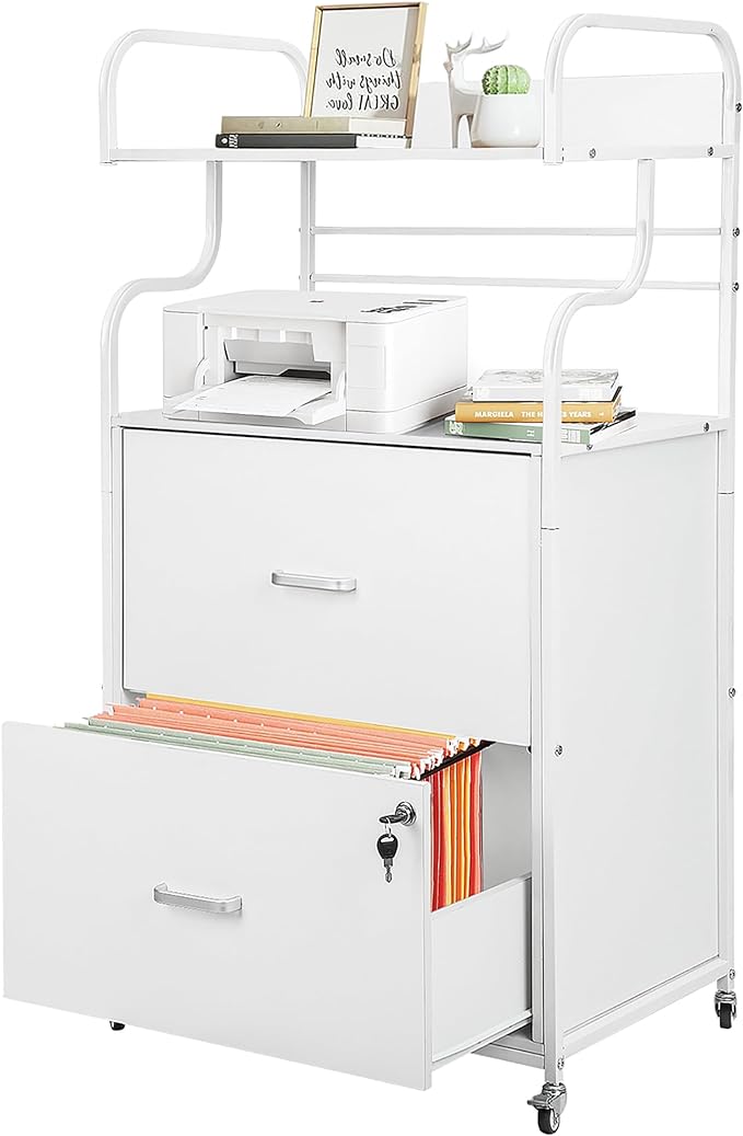 Vertical File Cabinet, 2 Drawer Mobile Filing Cabinet with 1 Bookshelf, Printer Stand with Open Storage Shelves Fits A4/Letter/Legal Size File Cabinets for Home Office Organizer, White