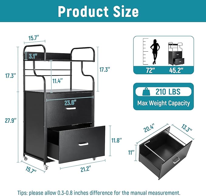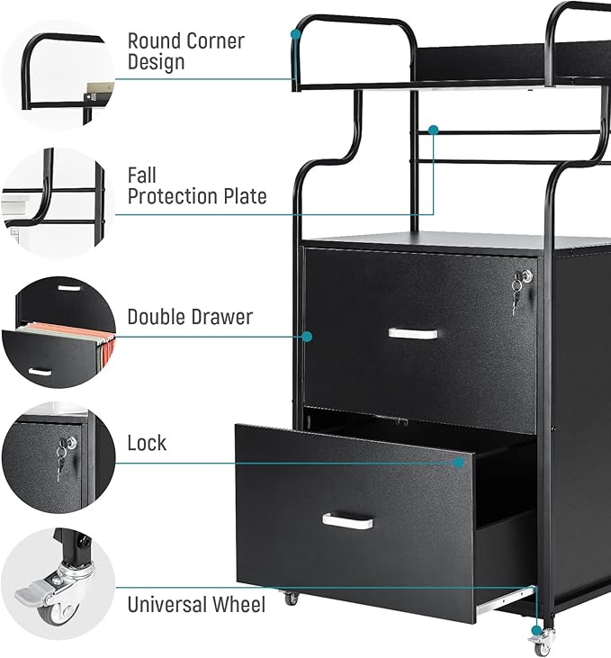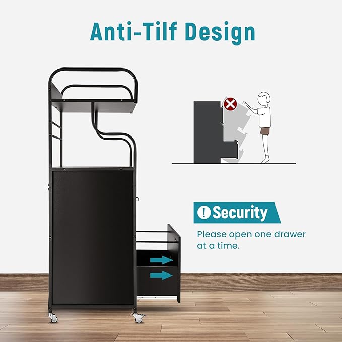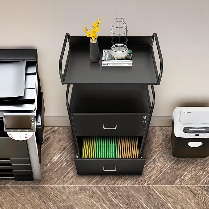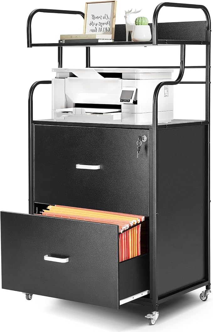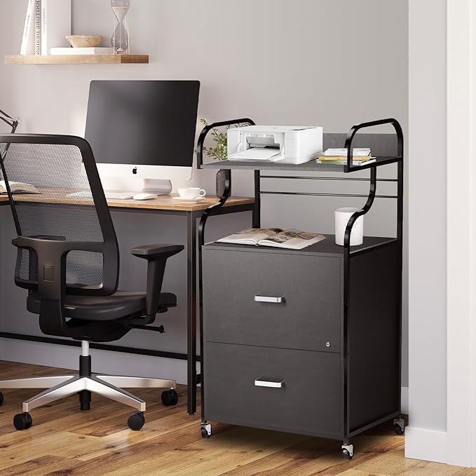 Vertical File Cabinet, 2 Drawer Mobile Filing Cabinet with 1 Bookshelf, Printer Stand with Open Storage Shelves Fits A4/Letter/Legal Size File Cabinets for Home Office Organizer, Black