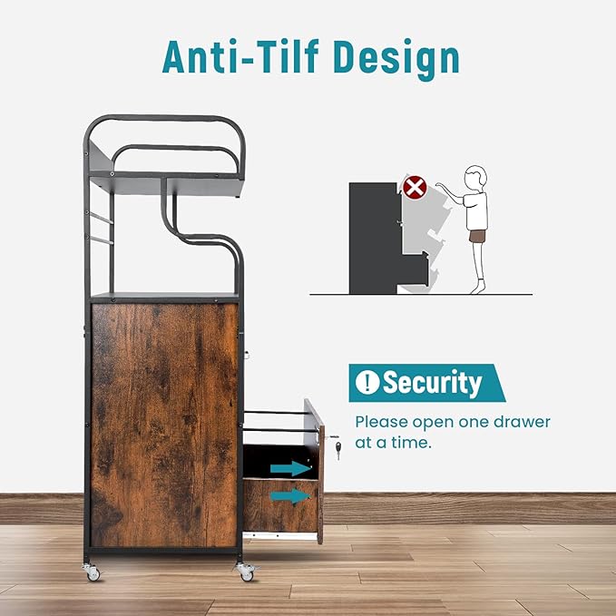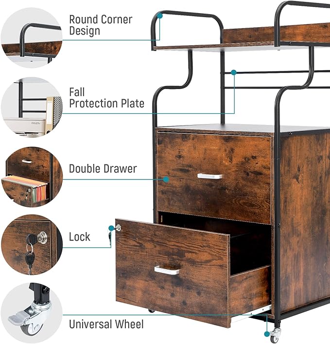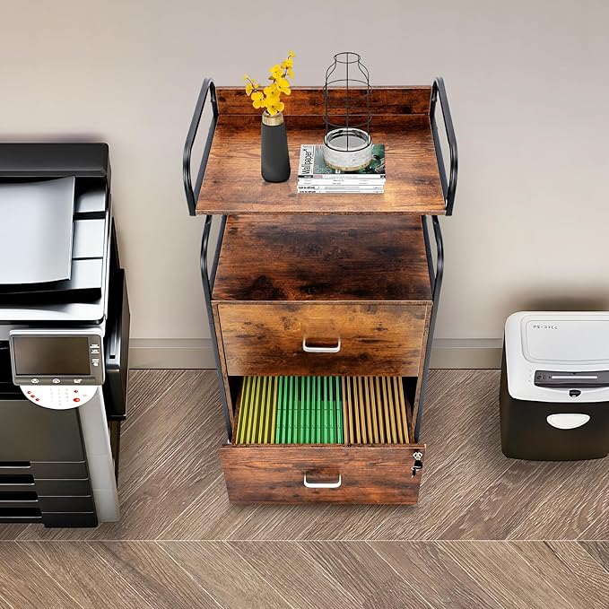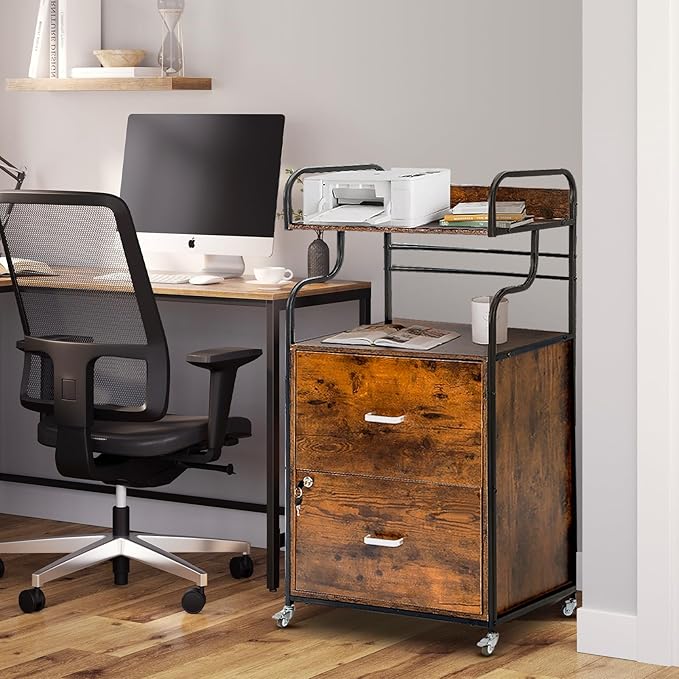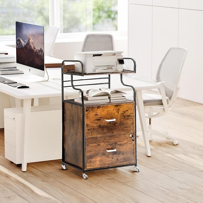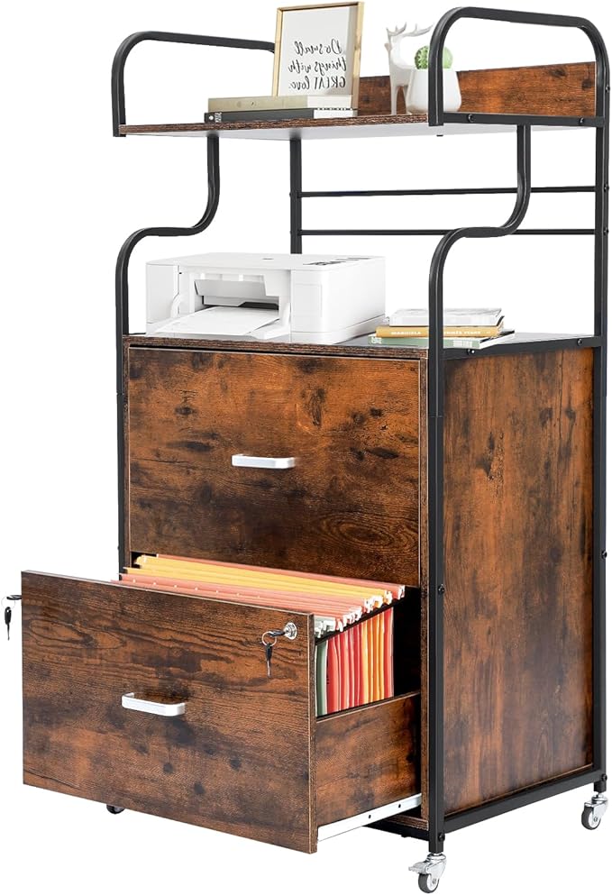 Vertical File Cabinet, 2 Drawer Mobile Filing Cabinet with 1 Bookshelf, Printer Stand with Open Storage Shelves Fits A4/Letter/Legal Size File Cabinets for Home Office Organizer, Brown