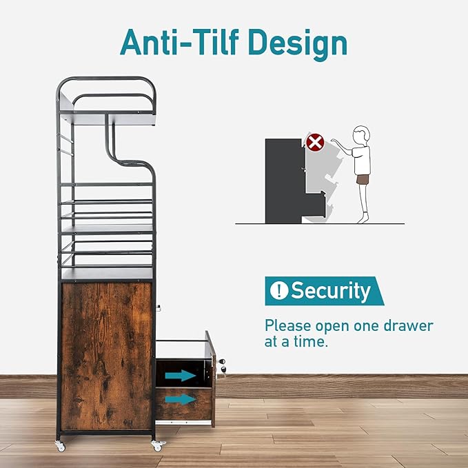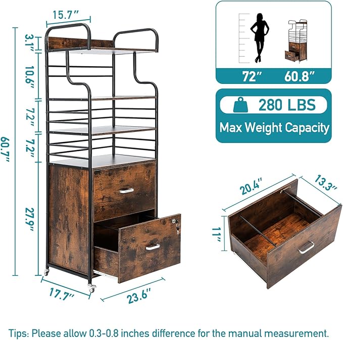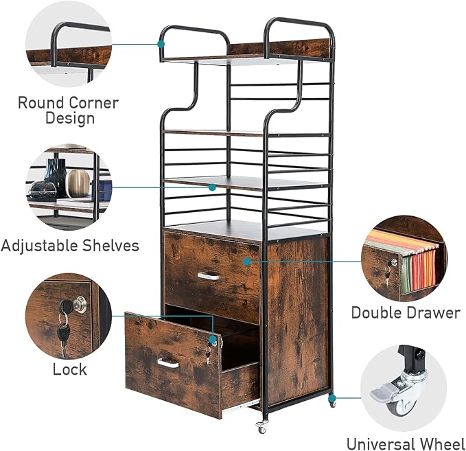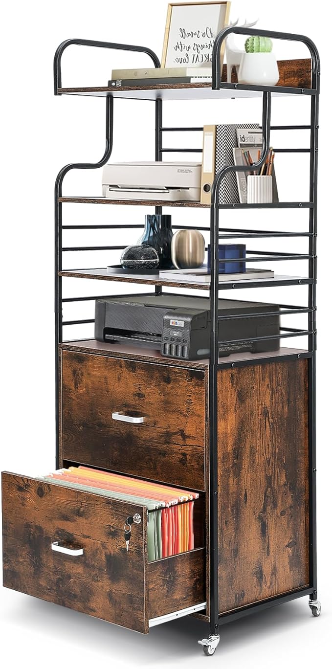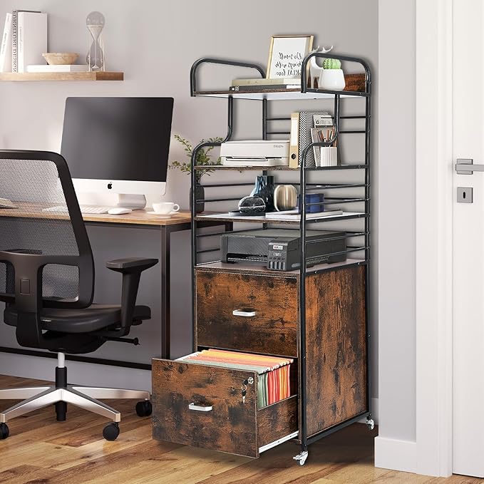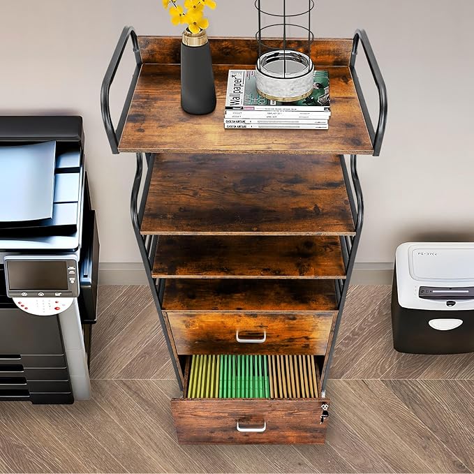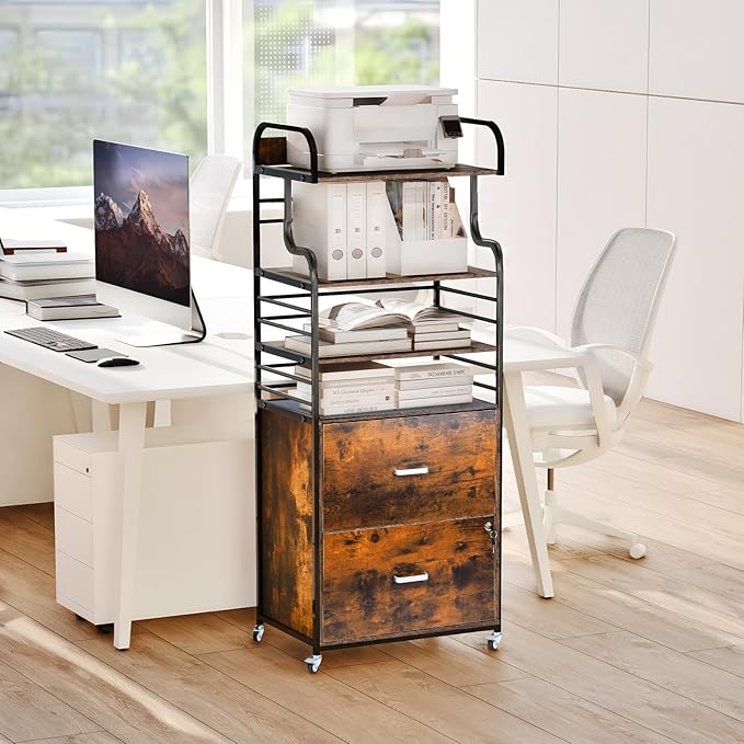 Vertical File Cabinet, 2 Drawer Mobile Filing Cabinet with 3 Bookshelf, Printer Stand with Open Storage Shelves Fits A4/Letter/Legal Size File Cabinets for Home Office Organizer, Brown