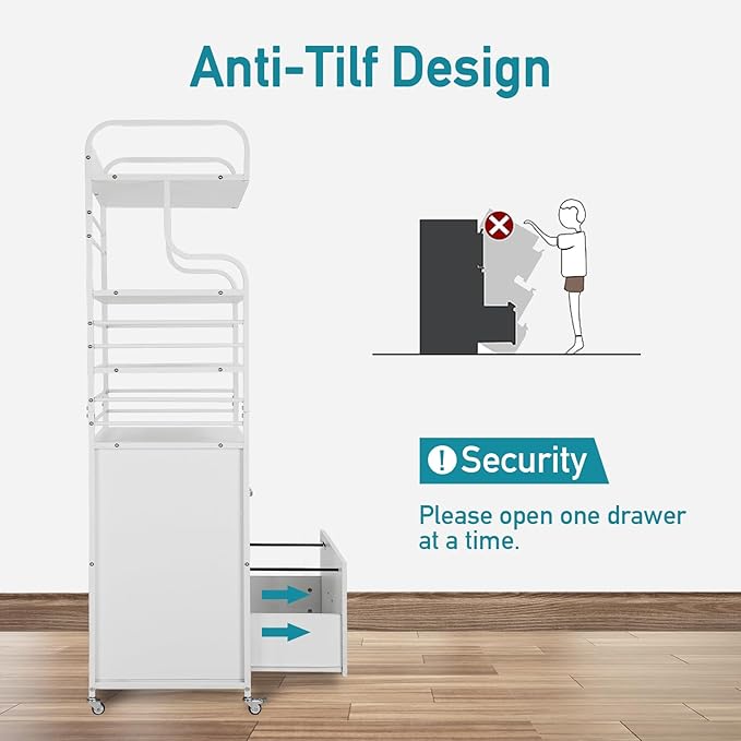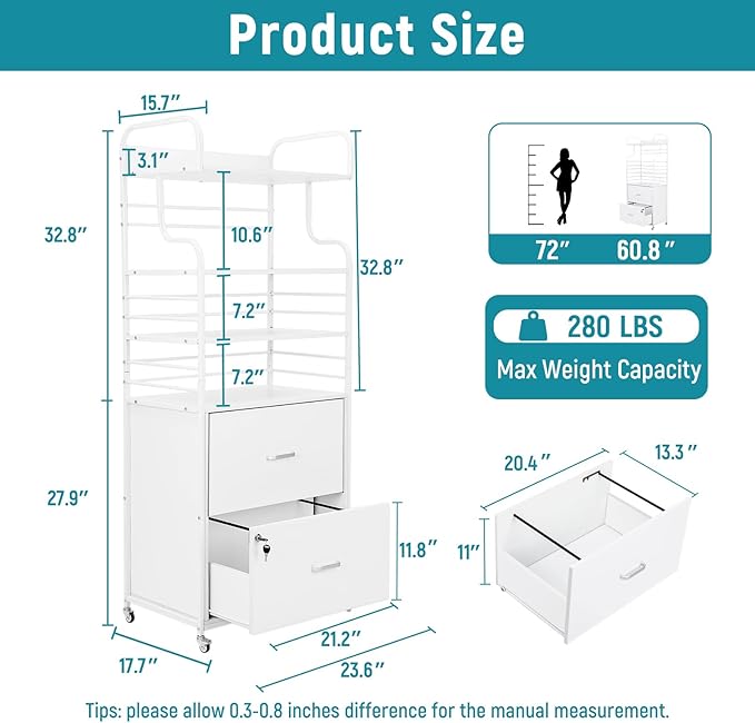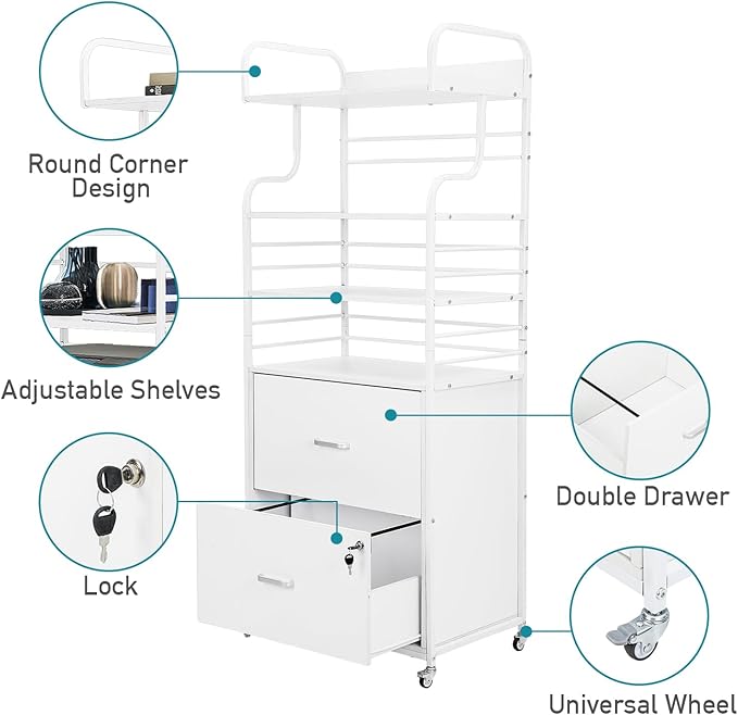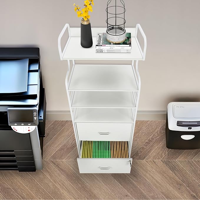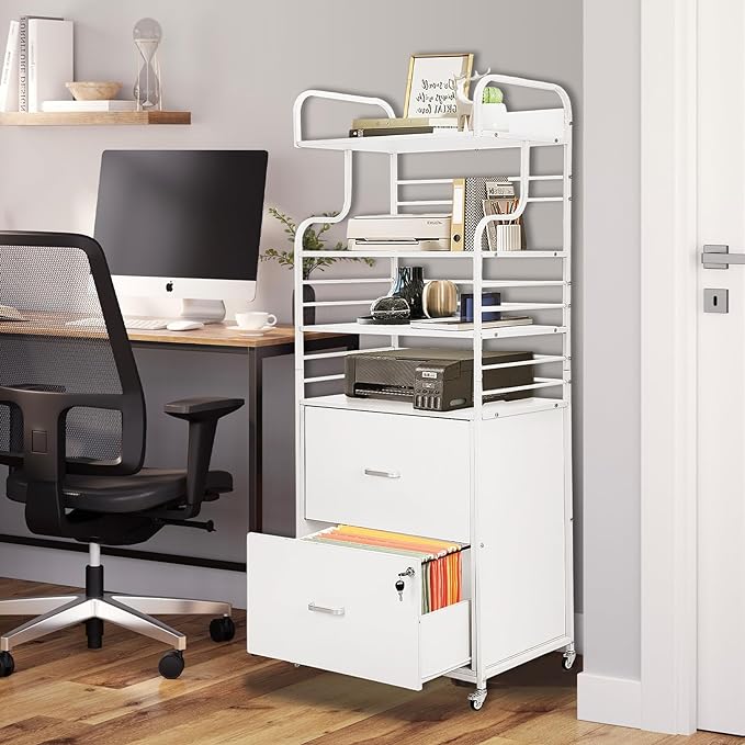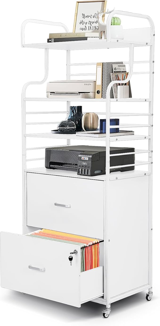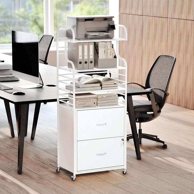 Vertical File Cabinet, 2 Drawer Mobile Filing Cabinet with 3 Bookshelf, Printer Stand with Open Storage Shelves Fits A4/Letter/Legal Size File Cabinets for Home Office Organizer, White