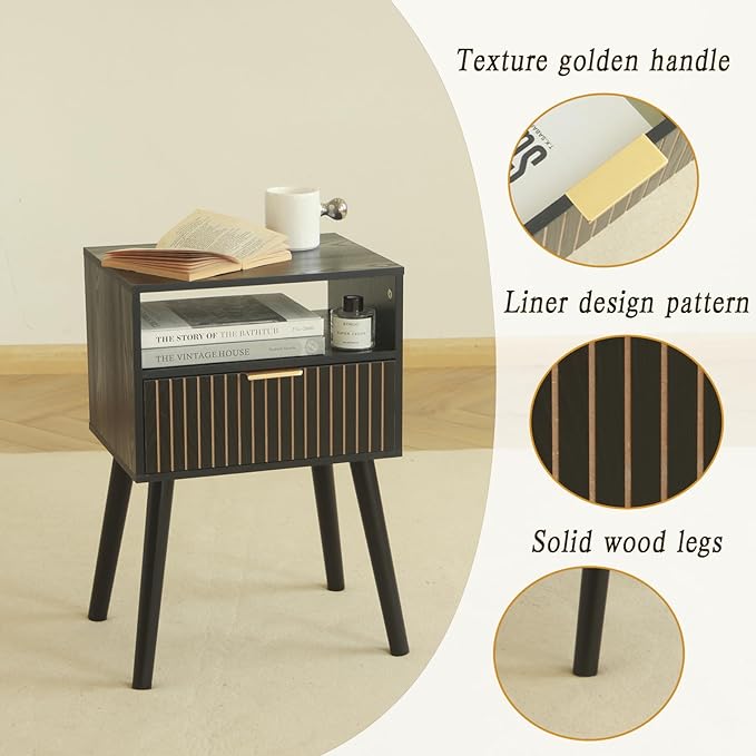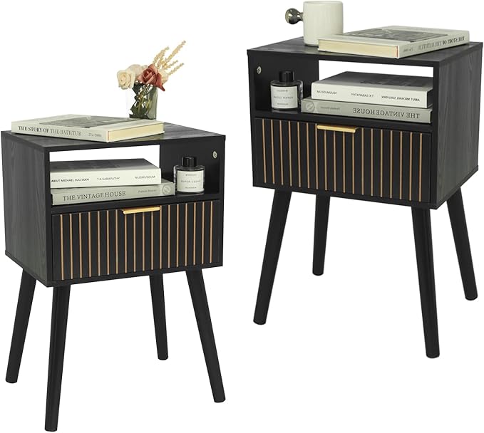 MaxSmeo Black Nightstand with Drawer, Bedside Table Set of 2, Mid Century Modern Nightstand with Open Shelf Storage, End Table with Solid Wood Legs, Black