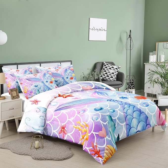 NINENINE Full Size Bedding Sets 5PCS Girls Mermaid Comforter Set Princess Toddler Bedding Sets Glitter Comforter Set(1Comforter, 1Flat Sheet, 1Fitted Sheet, 2Pillowcases)…