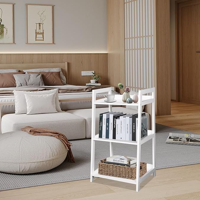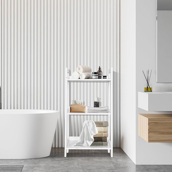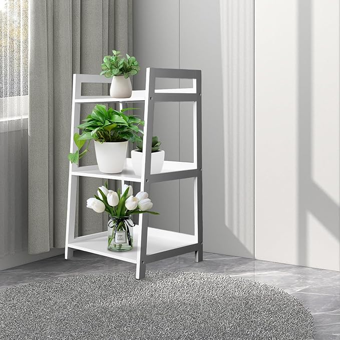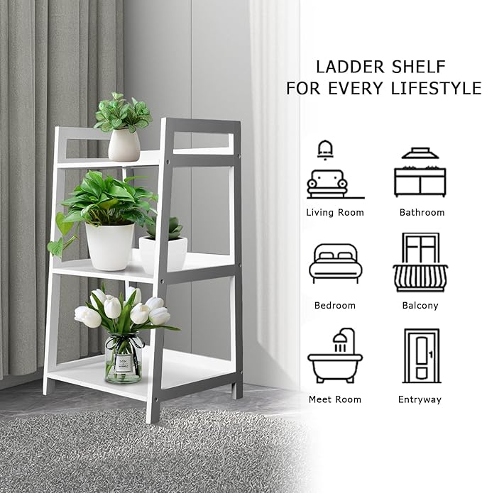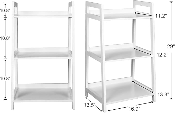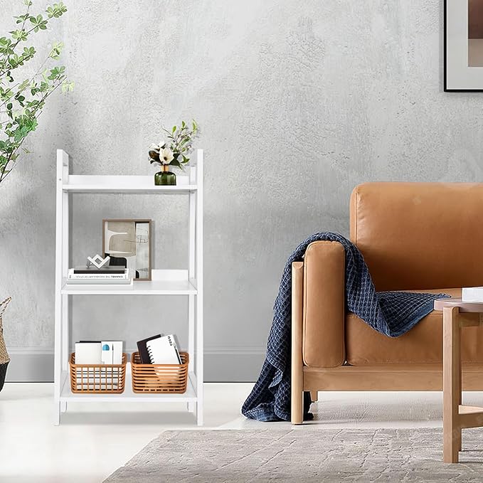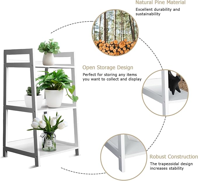 ECOMEX 3-Tier Ladder Shelf Modern Style Shelf, Ladder Bookshelf Open Storage Rack Wood Ladder Shelf with Solid Pine Frame, Freestanding Ladder Shelves for Home Office, Bedroom (White)