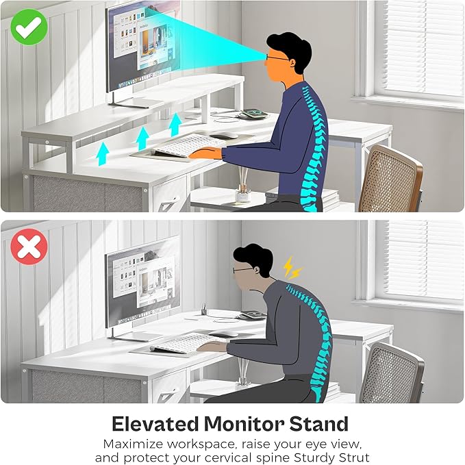 SUPERJARE 47 inch Reversible L Shaped Desk with LED Lights & Power Outlets, Computer Desk with Shelves & Monitor Stand, Gaming Desk with Drawer, Home Office Desk Corner Desk, PU White Drawer