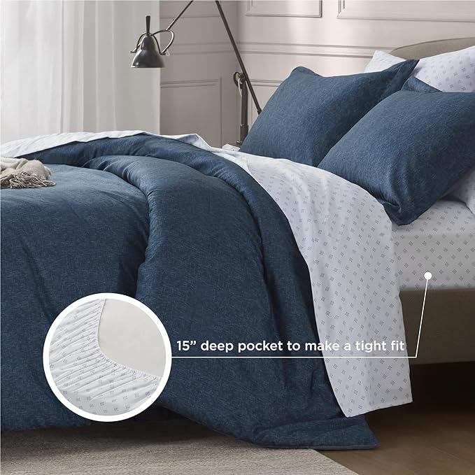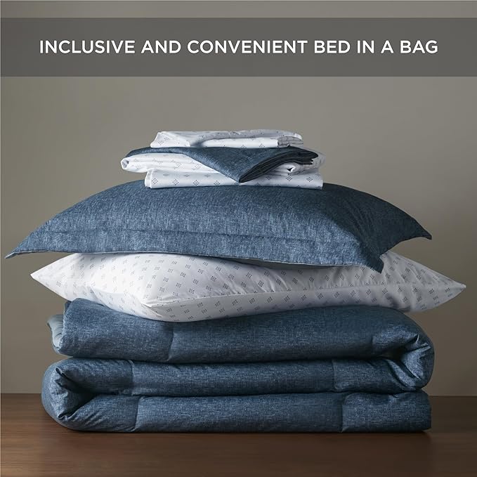 Chambray Queen Comforter Set - Blue Denim Queen Size Bedding Sets, 7 Pieces Soft Bedding for All Seasons with Comforter, Sheets, Pillowcases & Shams