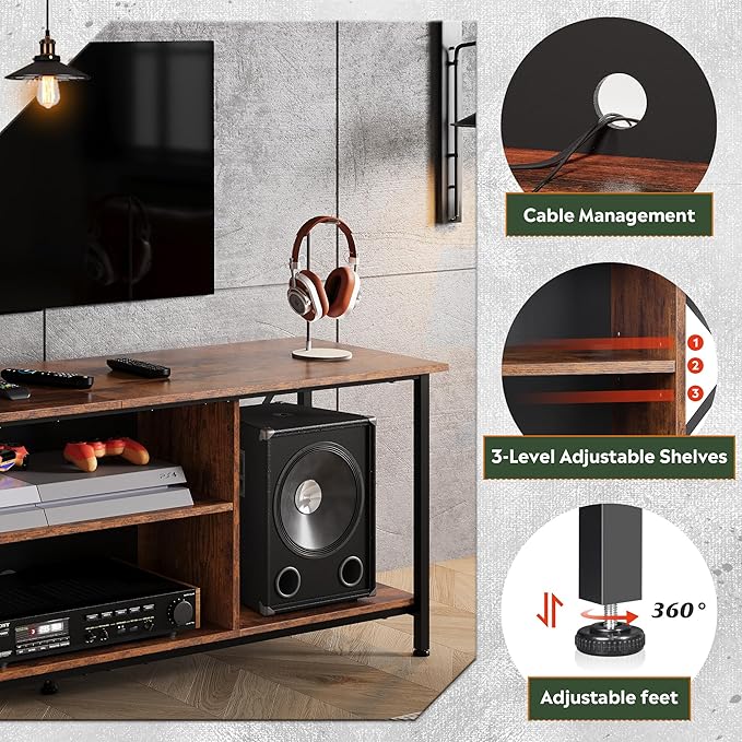 WLIVE TV Stand up to 65 Inch TV, 55" Entertainment Center, Industrial TV Console with Open Storage Shelf for Living Room and Bedroom, Rustic Brown