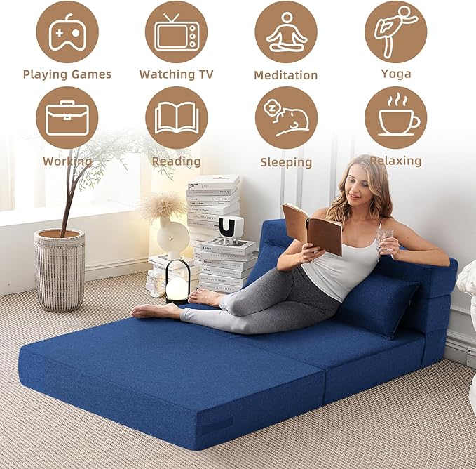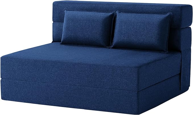 Convertible Folding Sofa Bed - Sleeper Chair with Pillow, Modern Linen Fabric Floor & Futon Couch, Foldable Mattress for Living Room/Dorm/Guest Use/Home Office/Apartment, Full Size, Navy Blue