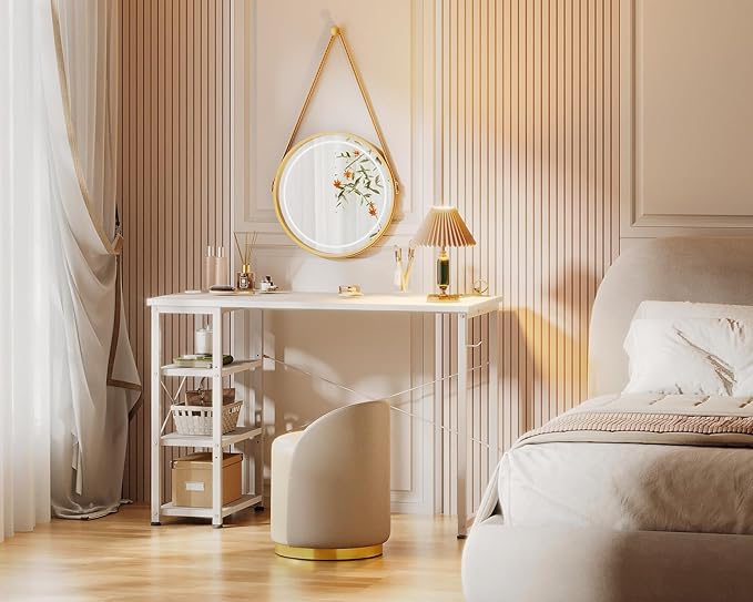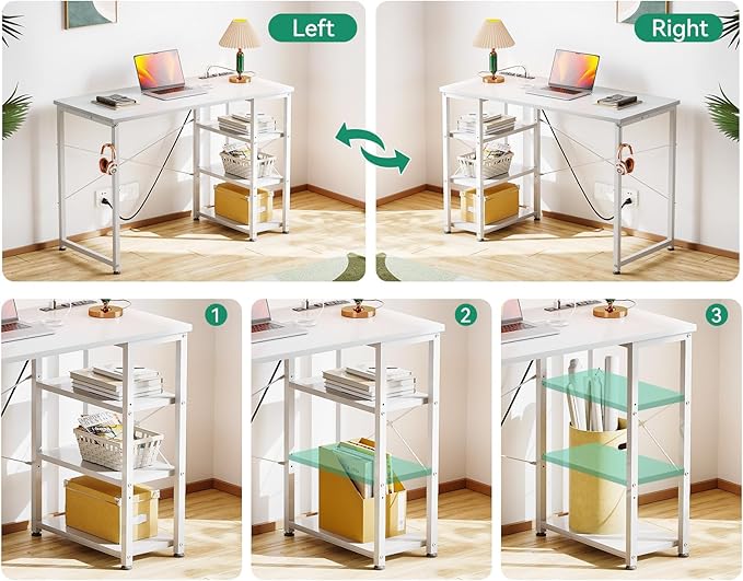 AODK Laptop Desk Small Desk, 40 Inch Computer Desk with Power Outlet and USB & Type-C Charging Port, Writing Desk with 3-Tier Reversible Storage Shelf for Home Office, 40'' x 16'', White